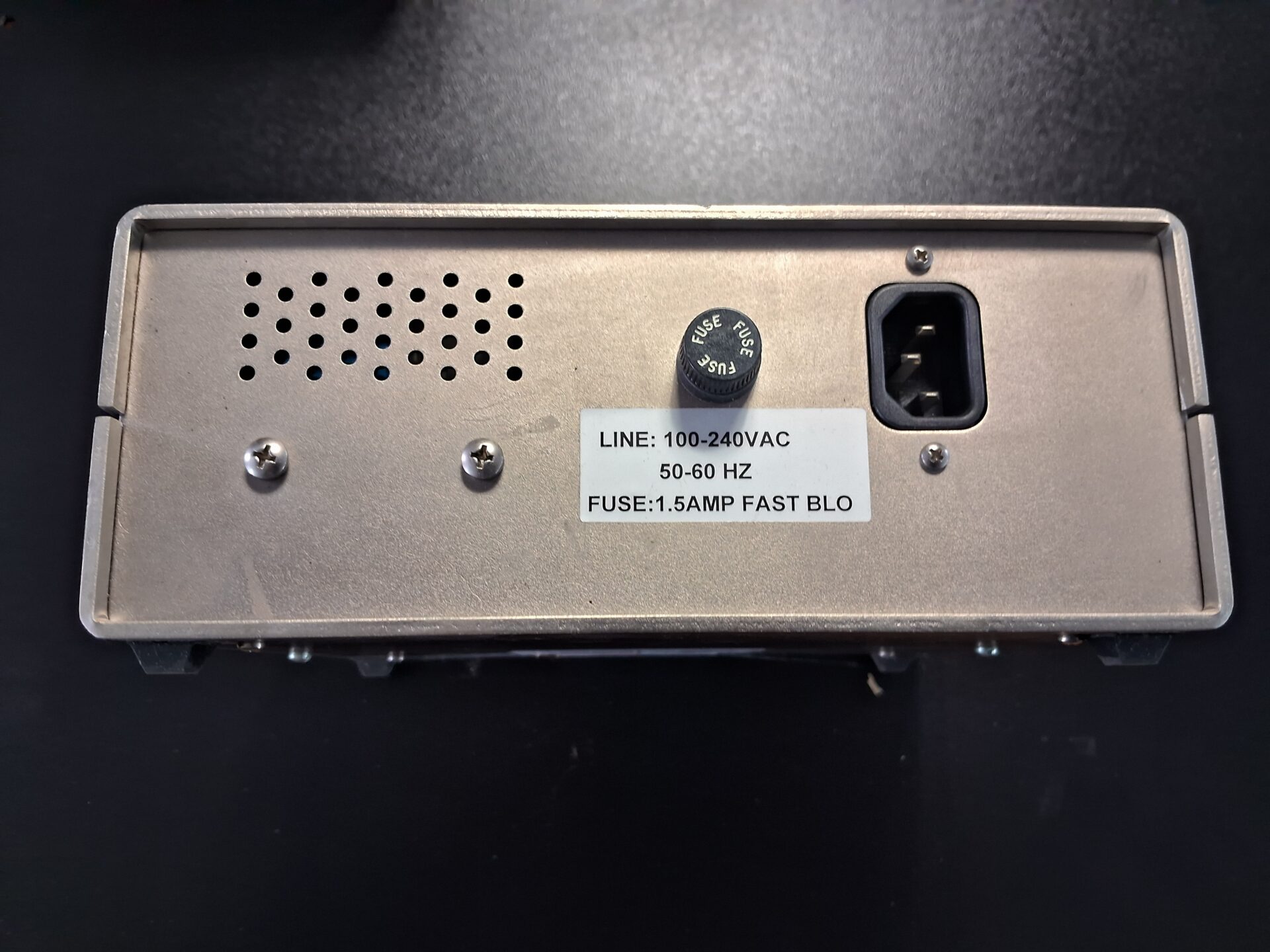 Universal 100-240VAC, 50-60 Hz input with 1.5A fast-blow fuse. Aluminum enclosure with safety label indicating hazardous 110/220V internal voltages; service access only for qualified personnel.