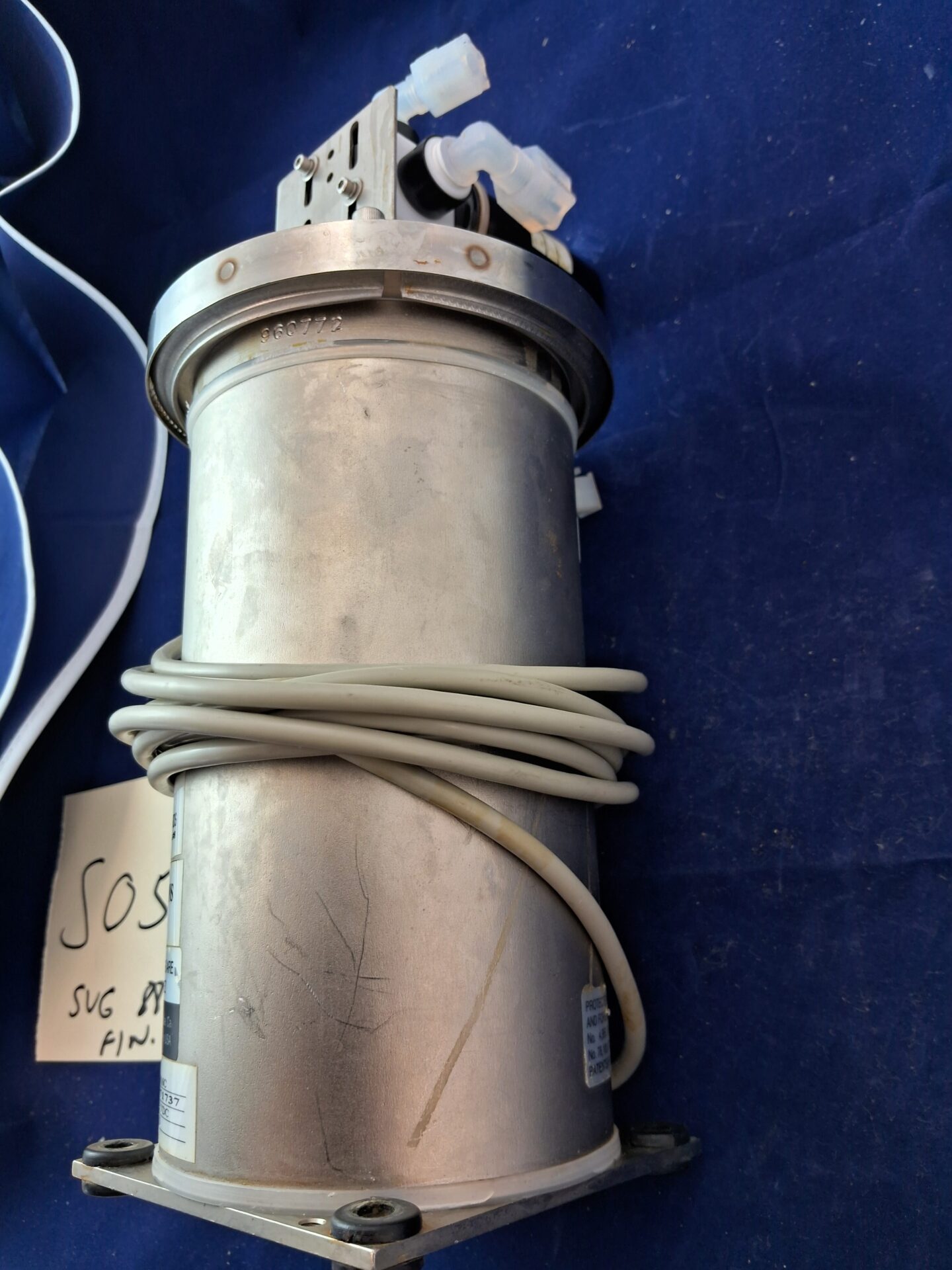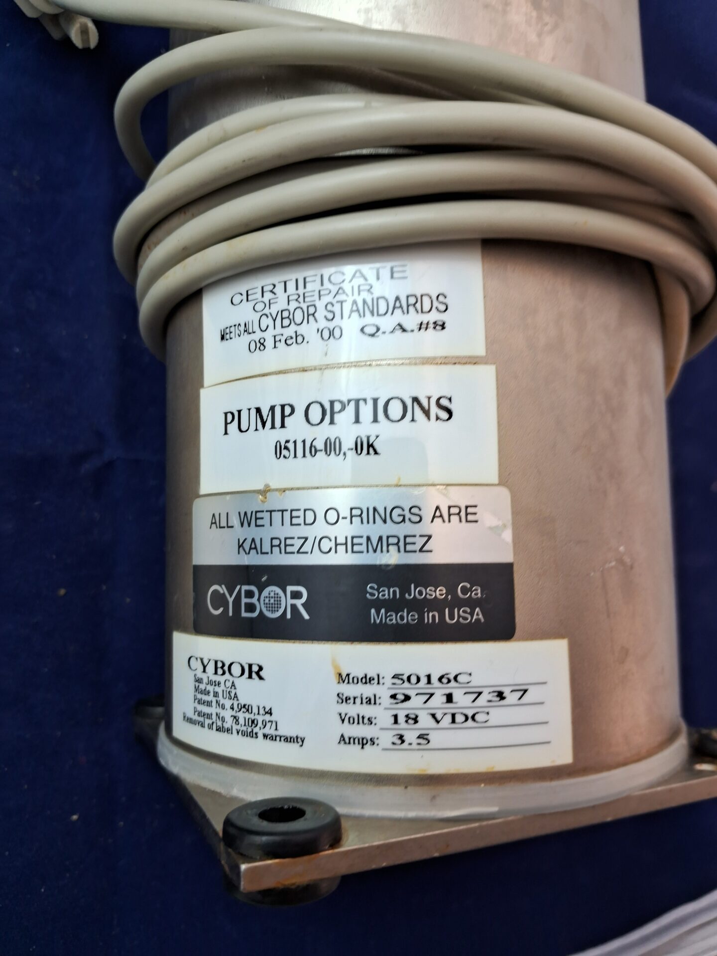 1) Cybor Model 5016C Positive Displacement Photoresist Dispense Pump – 18VDC power supply, 3.5A current draw, stepper motor driven electrohydraulic pump for precise photochemical dispensing, viscosity range 1-3000 cps, designed for accurate repeatable dispense control in semiconductor fabrication, ideal for photoresist, solvents, developers, and specialty chemicals, all wetted surfaces with Teflon compatibility, original equipment from Cybor Corporation (IDI Cybor).