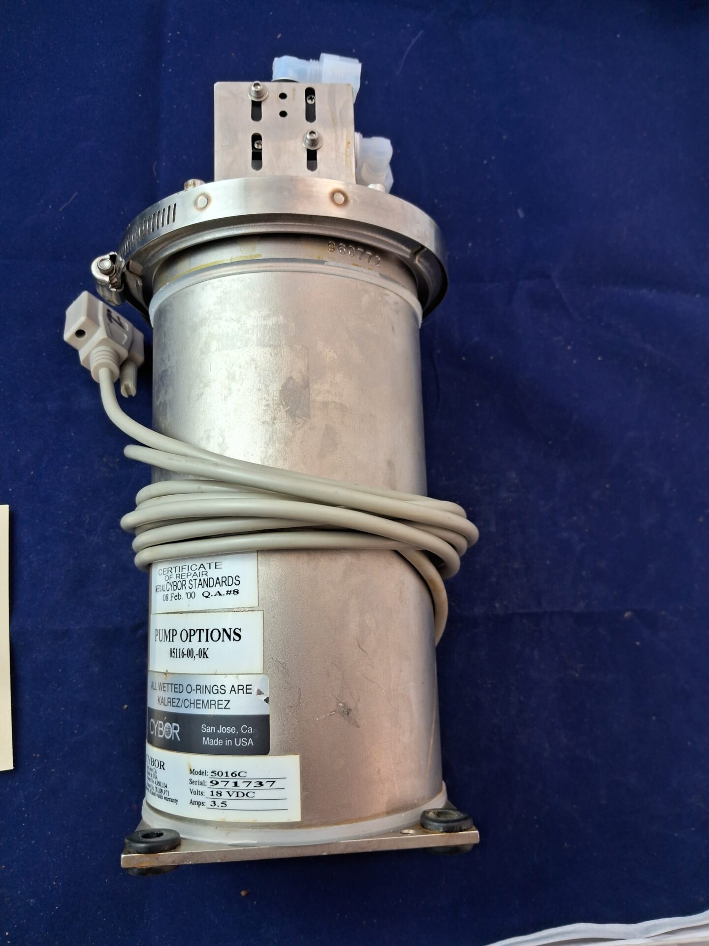 Certificate of Repair meets Cybor Standards, dated 08 Feb 2000, Pump Options 05116-00-0K. Used refurbished condition, Suitable for industrial equipment maintenance, semiconductor fab restoration, or process control equipment applications. Manual-controlled dispense system.