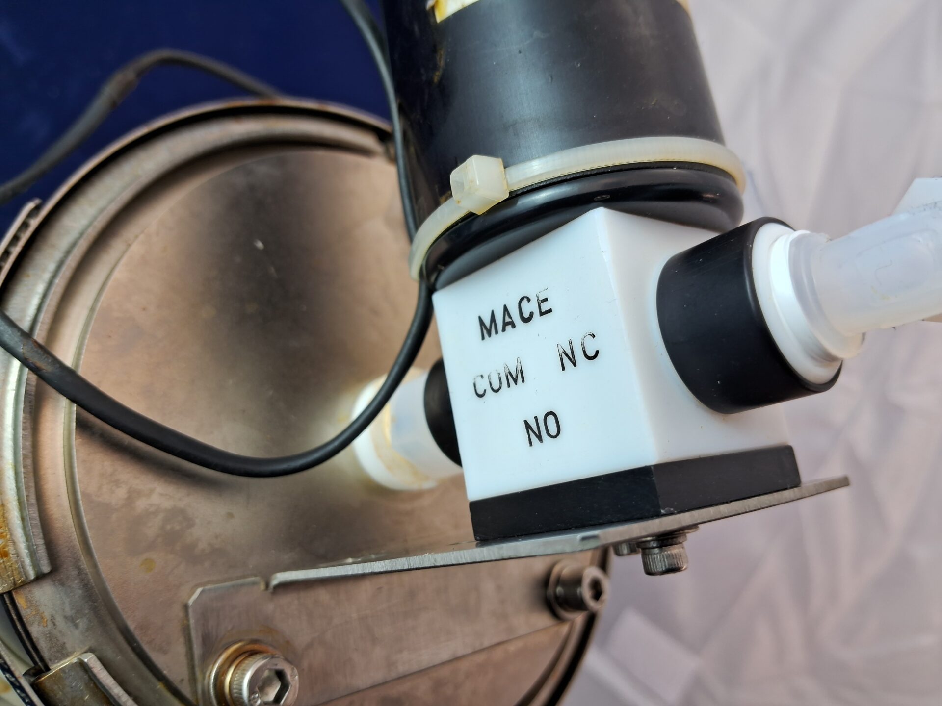 2) MACE Cumulative Mass Flow Meter – CUM NC configuration for monitoring and measuring fluid dispensing volume, precision mass flow measurement device integrated with pump assembly, ensures accurate chemical consumption tracking, typical of 1990s-2000s semiconductor track systems (SVG 8800/8900 series).
