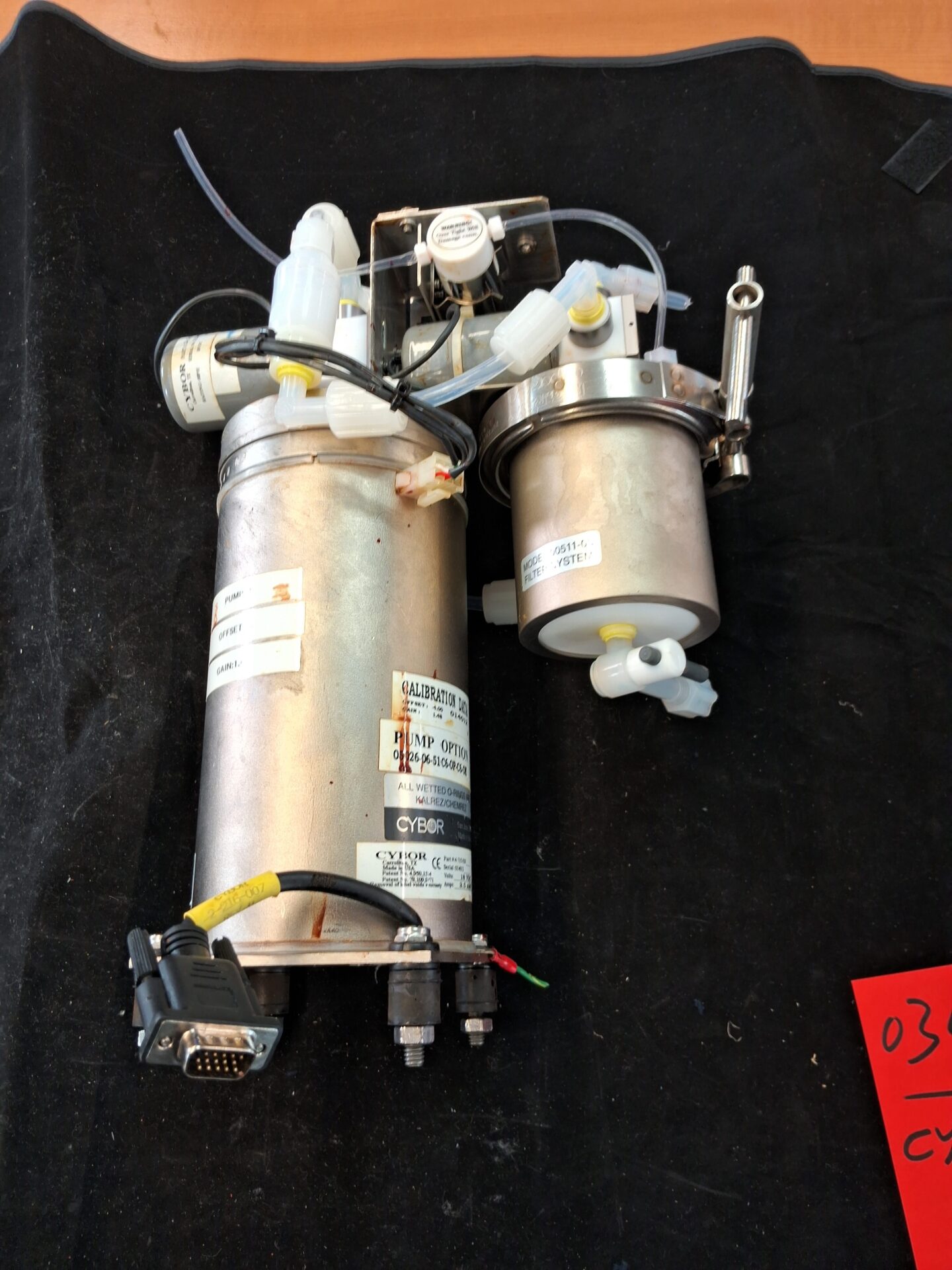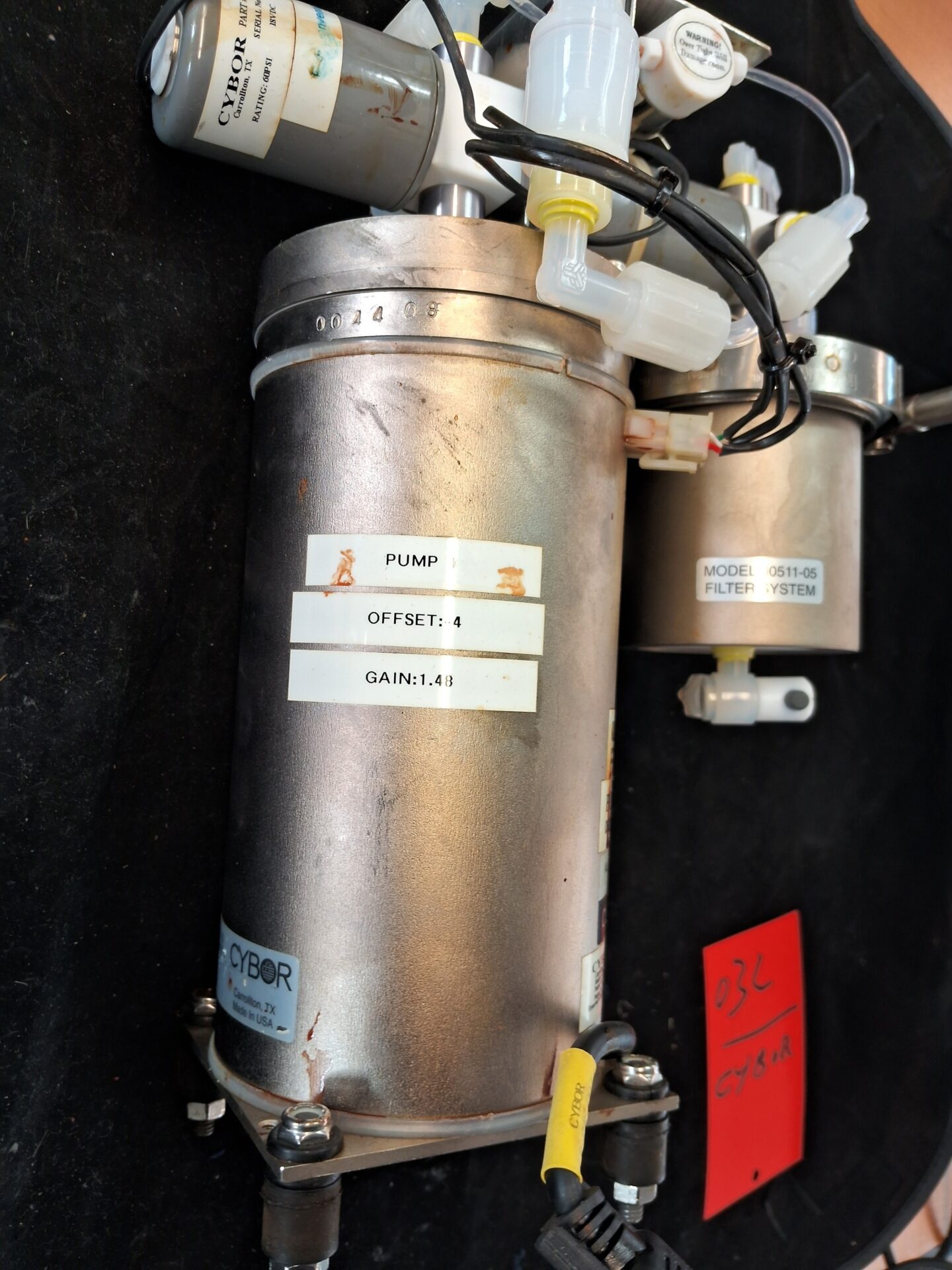 CYBOR dual filter pump system with primary filter Model 00511-05 and integrated CYBOR dosing pump (Part 4-715-020, 18VDC, 3.5A) with high-purity Kalrez/Chemrez O-rings. Includes additional fluid component (Part 2-215-04, 60PSI, Serial 11246228). Full mount, all lines/fittings included. Used condition, from professional environment.