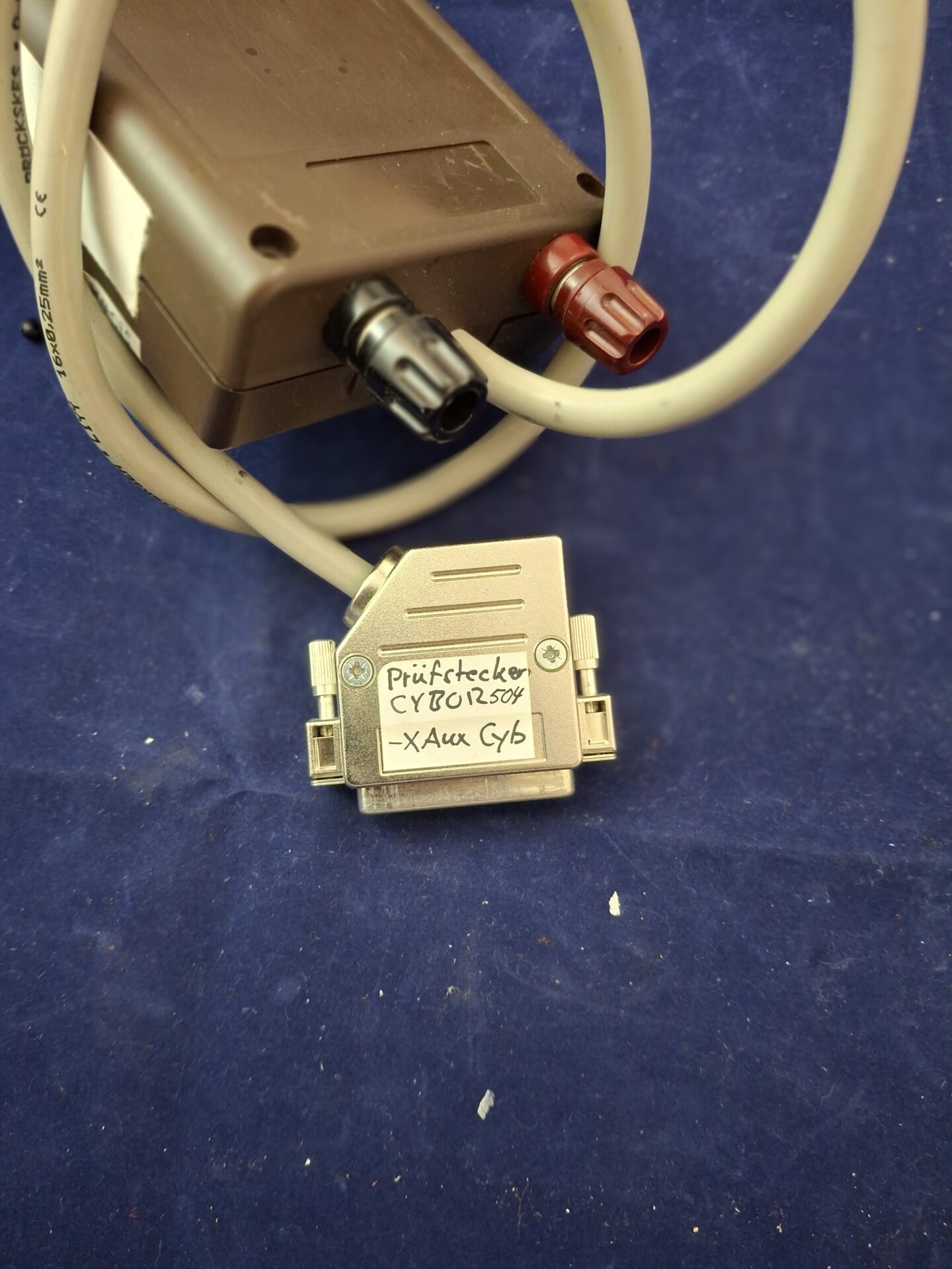 Portable diagnostics tool with Prüfstecker (test plug), 4 trigger/start switches, 4-channel status LED display, connection cable, and D-sub connector (XAUX CyB).