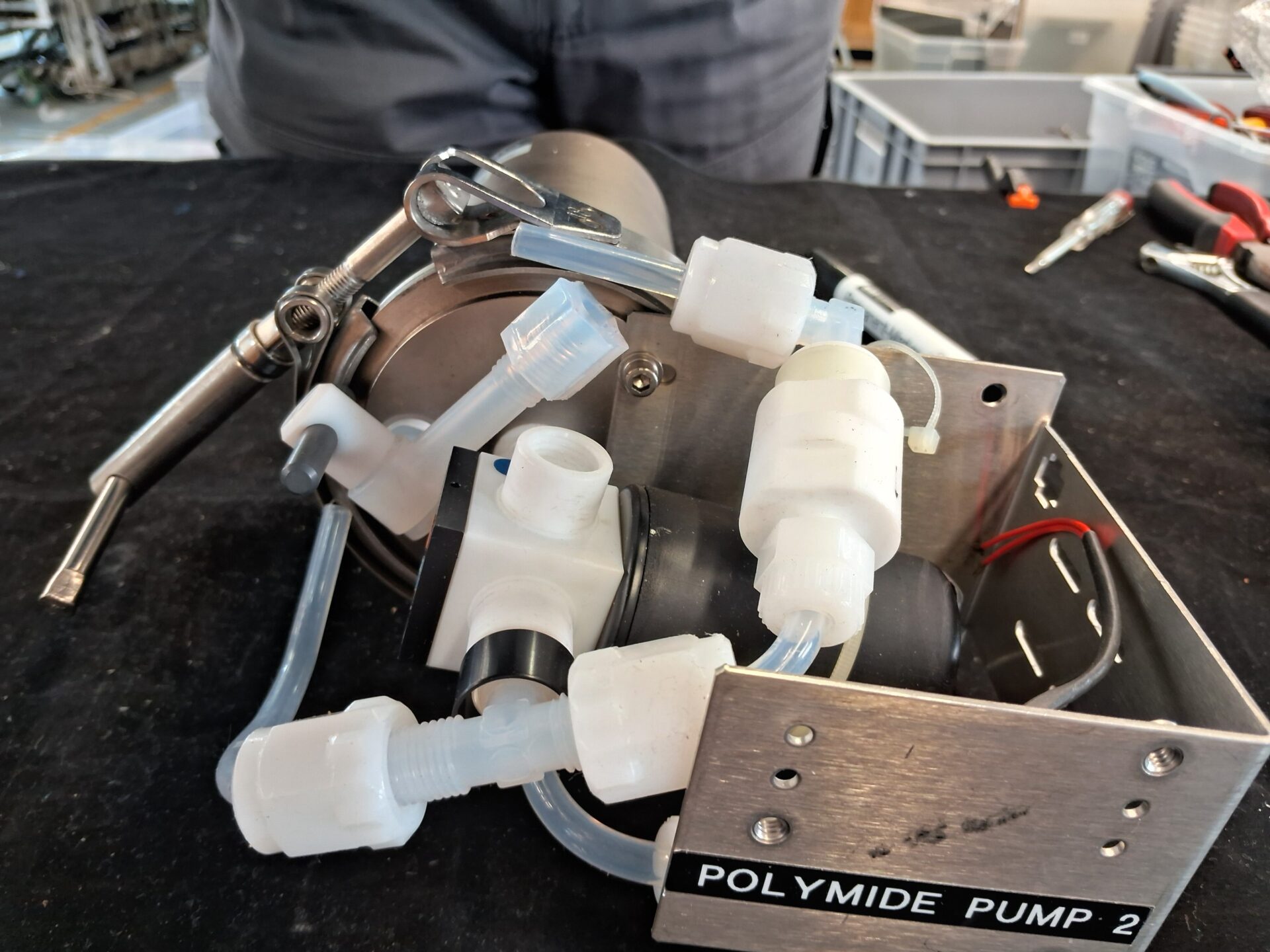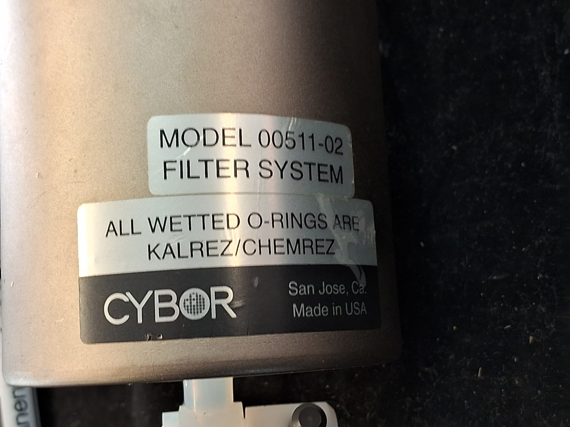 CYBOR Filter System Model 00511-02 with all wetted O-rings made from Kalrez and Chemrez materials for excellent chemical resistance. Ideal for high-purity fluid filtration in semiconductor and chemical processes. Robust metal housing, used condition.