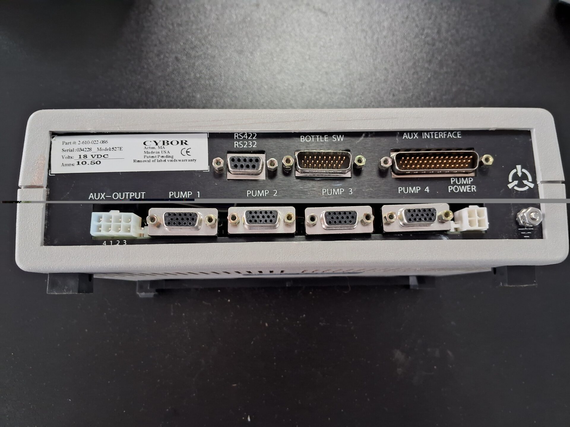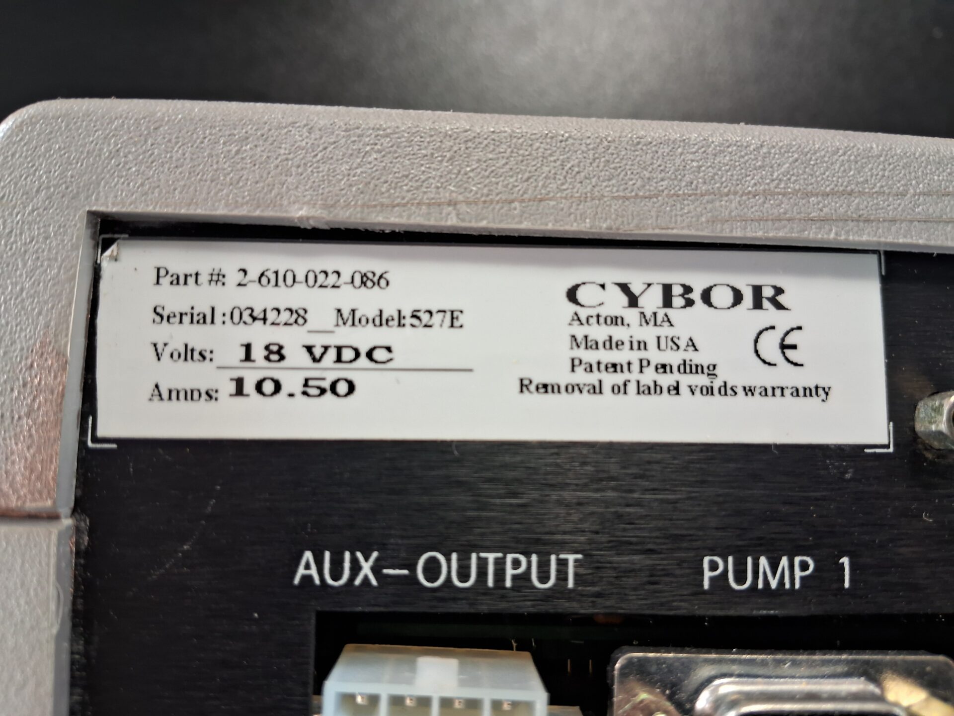 Cybor pump controller module Model 527E, Part No. 2-610-022-086, Serial Number 034228.