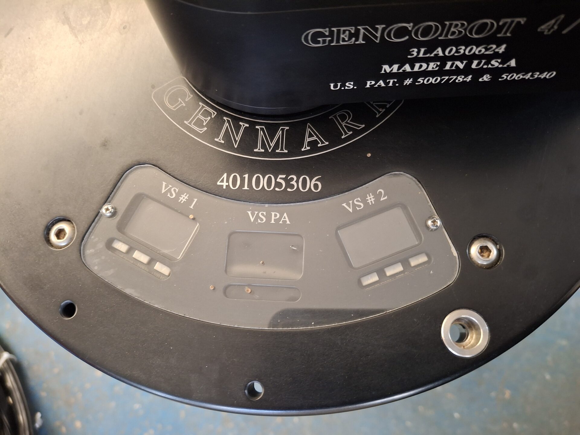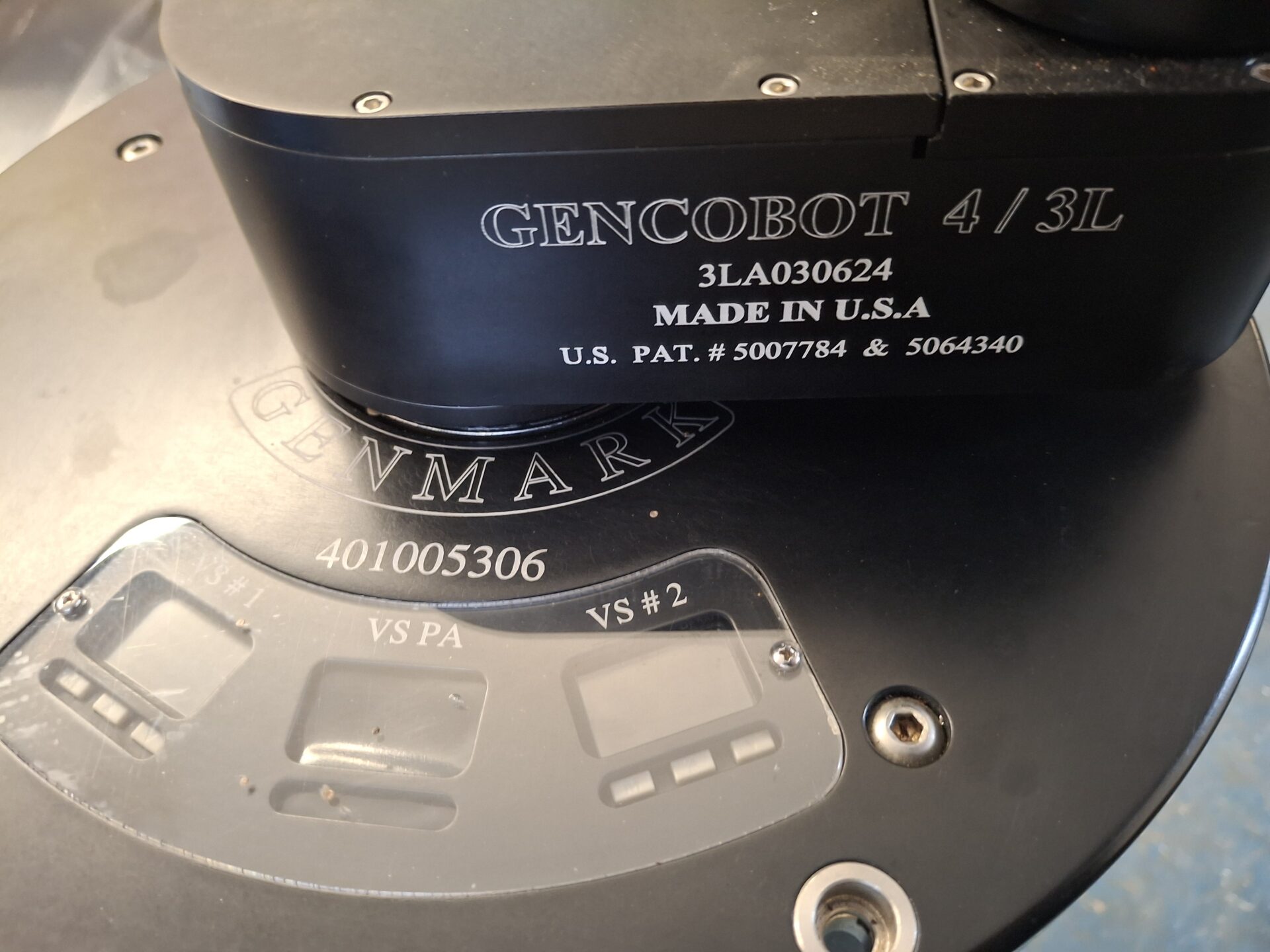 Genmark GENCOBOT 4/3L Wafer Handling Robot, model 4/3L, P/N 401005306, arm S/N 3LA030624. U.S. Pat. #5007784 & #5064340.