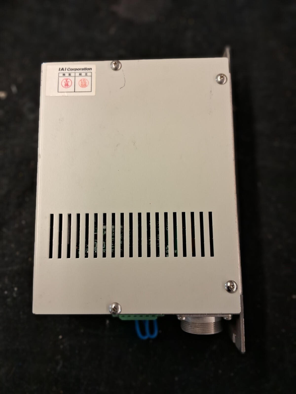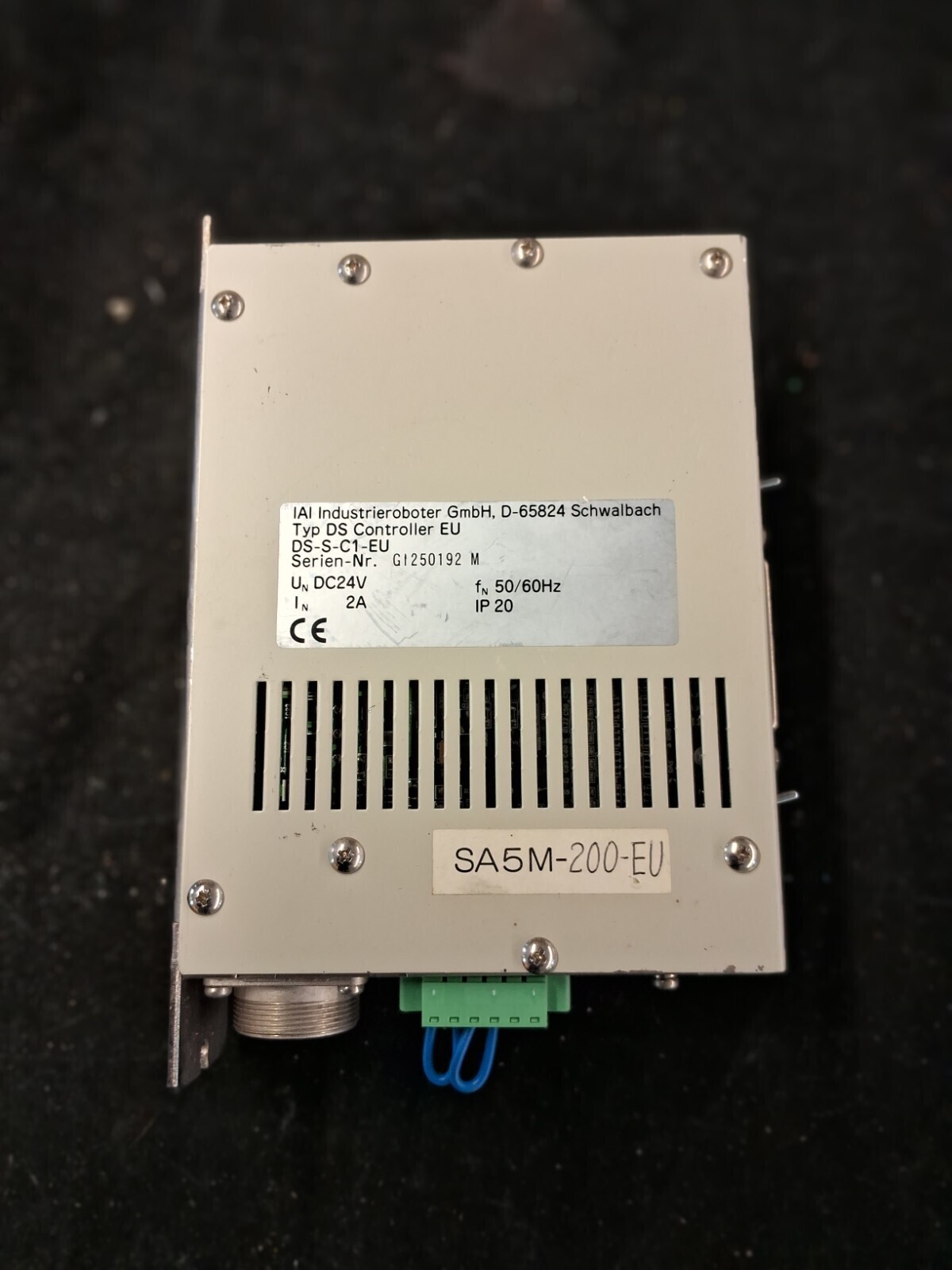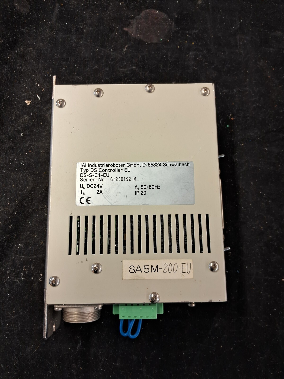 Metal connector EU type with green terminal block power connection. Compatible with IAI DS-SA5M actuator series. Unit weight 877g. Serial number GI250192 M. Used condition with normal cosmetic wear.