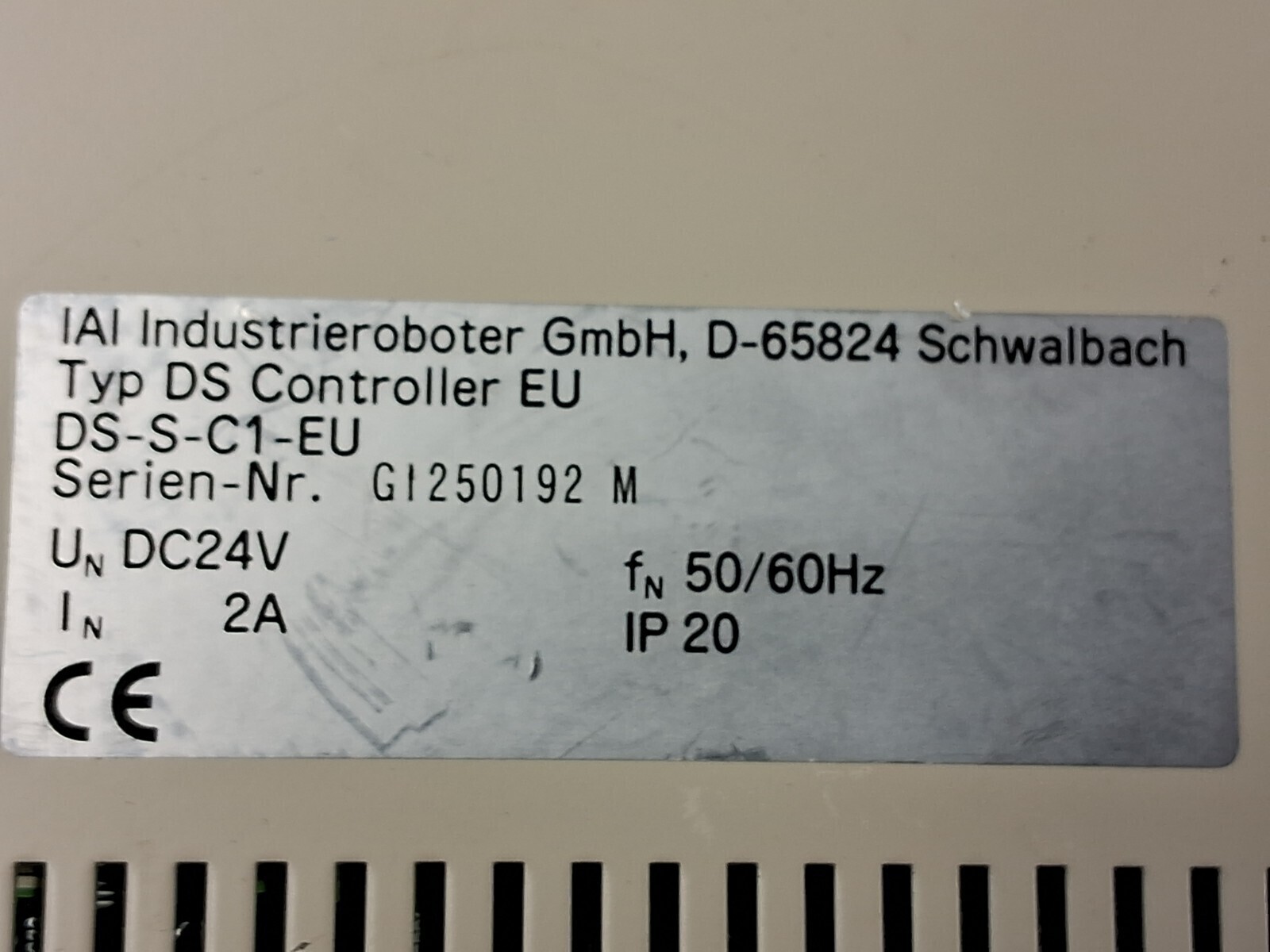 IAI Industrieroboter GmbH DS Controller EU for DS series actuators. This single-axis servo position controller features a 3-digit CODE display with READY/ALARM/BAT status LEDs, brake release and normal mode switches, teaching/RS232 port for programming, and external I/O connections.