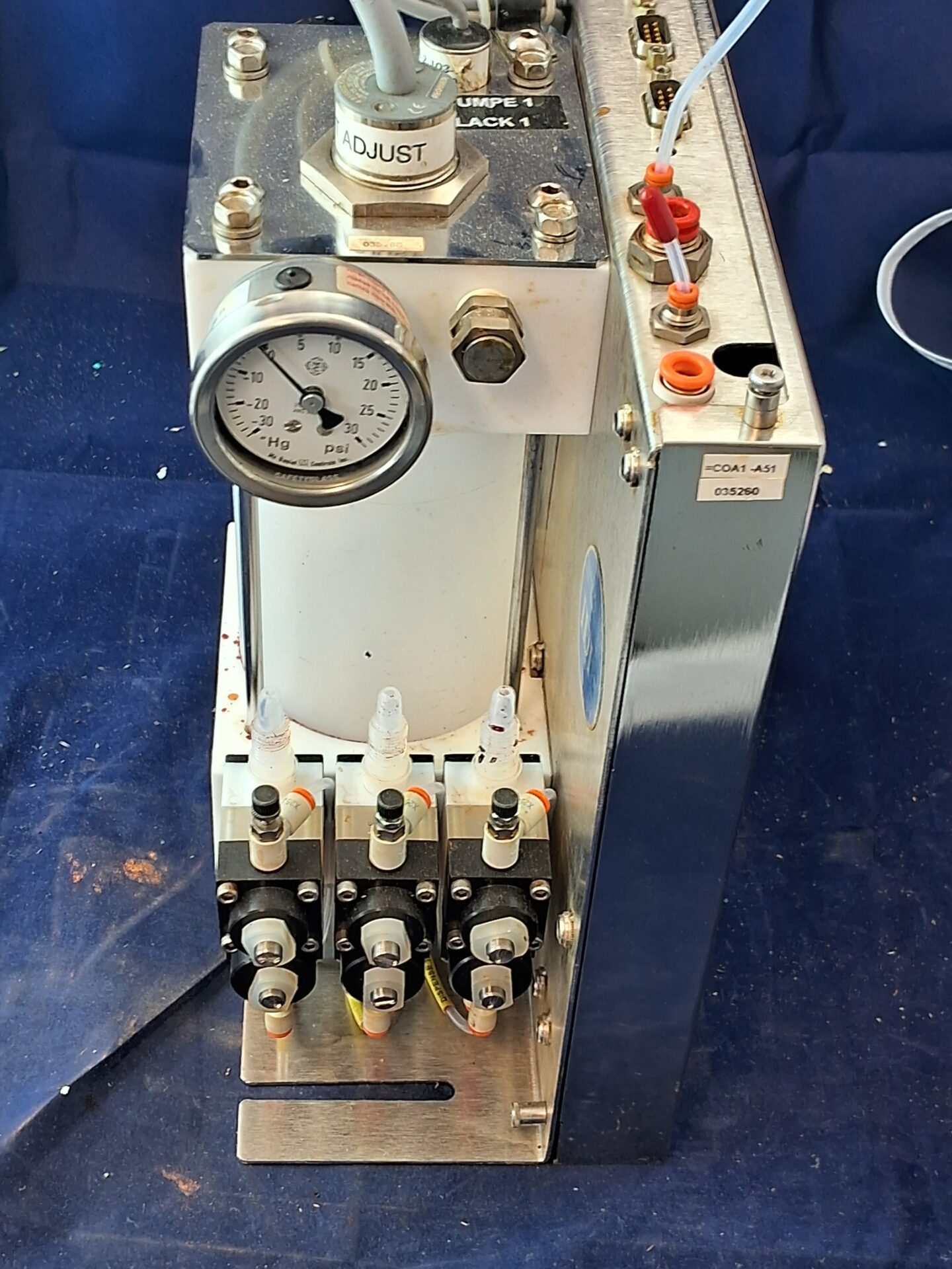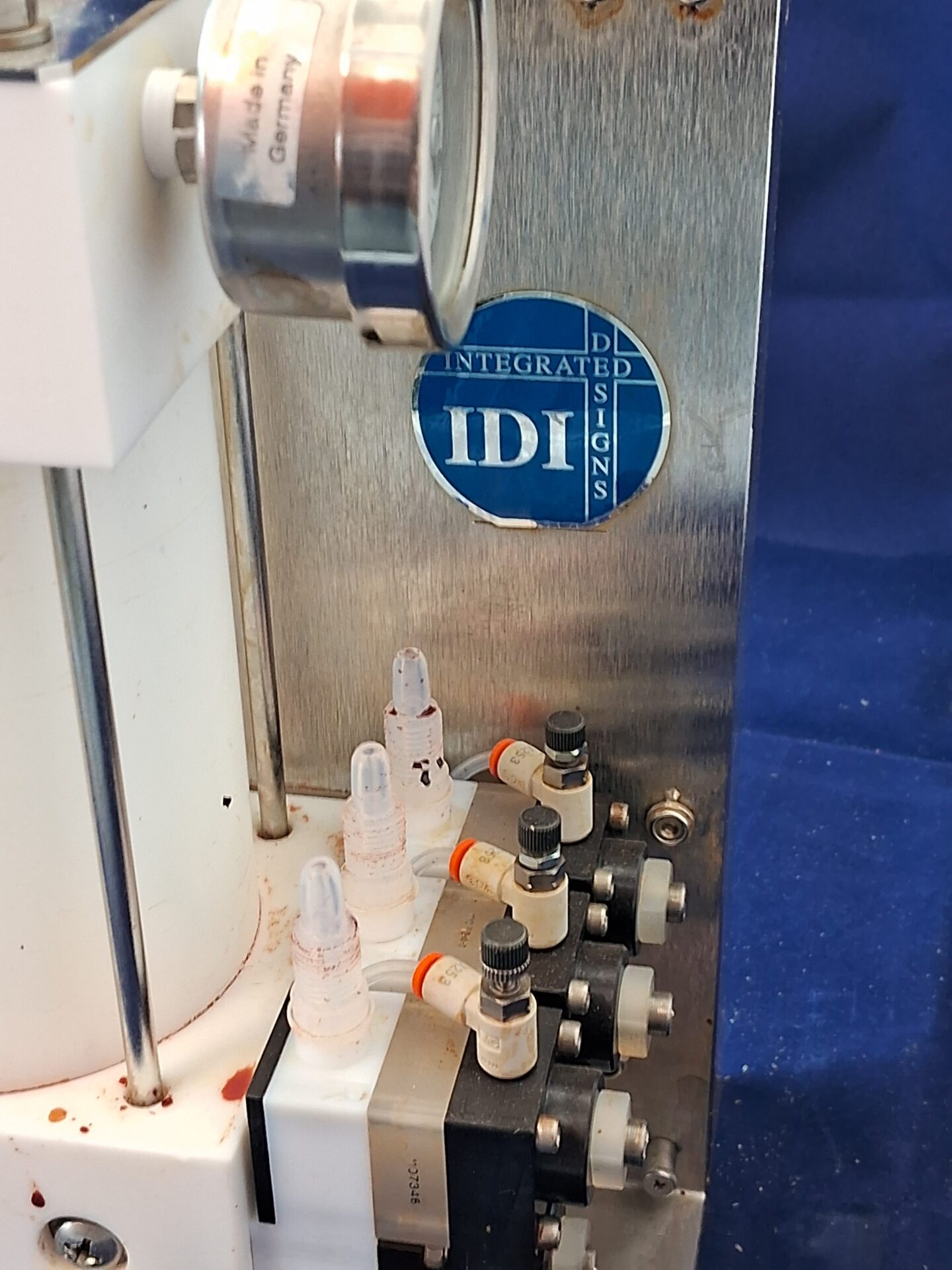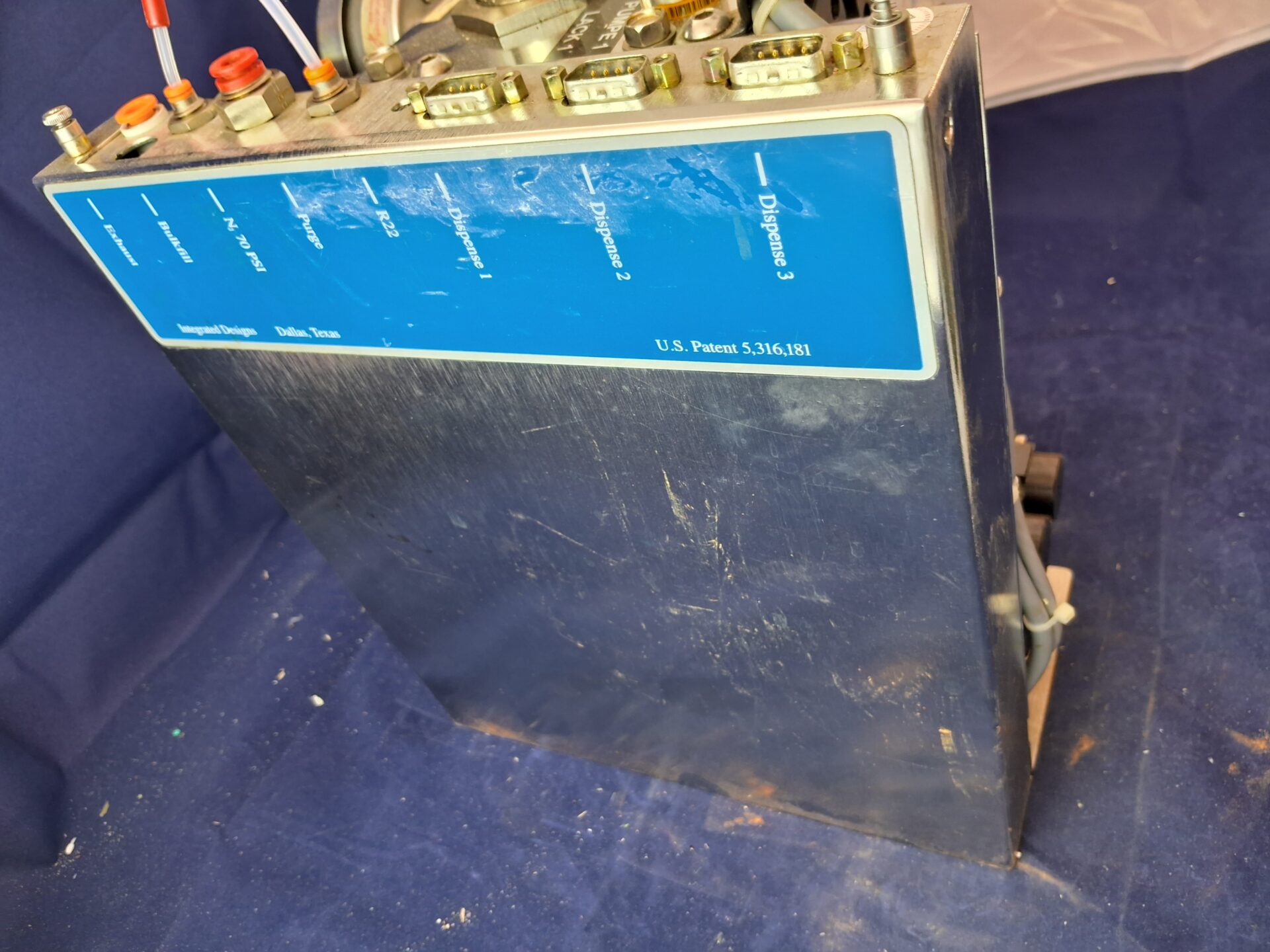This is a complete mass flow control system featuring: (1) Integrated Designs, LP (IDI) precision instrumentation with established history in semiconductor and industrial gas flow applications; (2) Model 303-M6HI-16 designation indicating 16-position mass flow control configuration; (3) Complete control interface with analog pressure gauge (0-60 PSI range visible), manual adjustment valve with calibrated dial, flow monitoring indicator; (4) Dual-row connector interface (visible DB connectors) for electronic control and data acquisition; (5) Multiple needle valve control elements with orange/red indicator switches for individual channel selection; (6) Internal diaphragm-operated regulating mechanism with tuning/adjustment capability; (7) Industrial-grade manifold construction with stainless steel and brass components; (8) Revision D-01 indicates mature production design with engineering refinements; (9) U.S. Patent 5,316,181 (visible on device) – patented flow control technology; (10) Complete pneumatic/electrical interface – ready for bench testing or integration into laboratory/production systems.