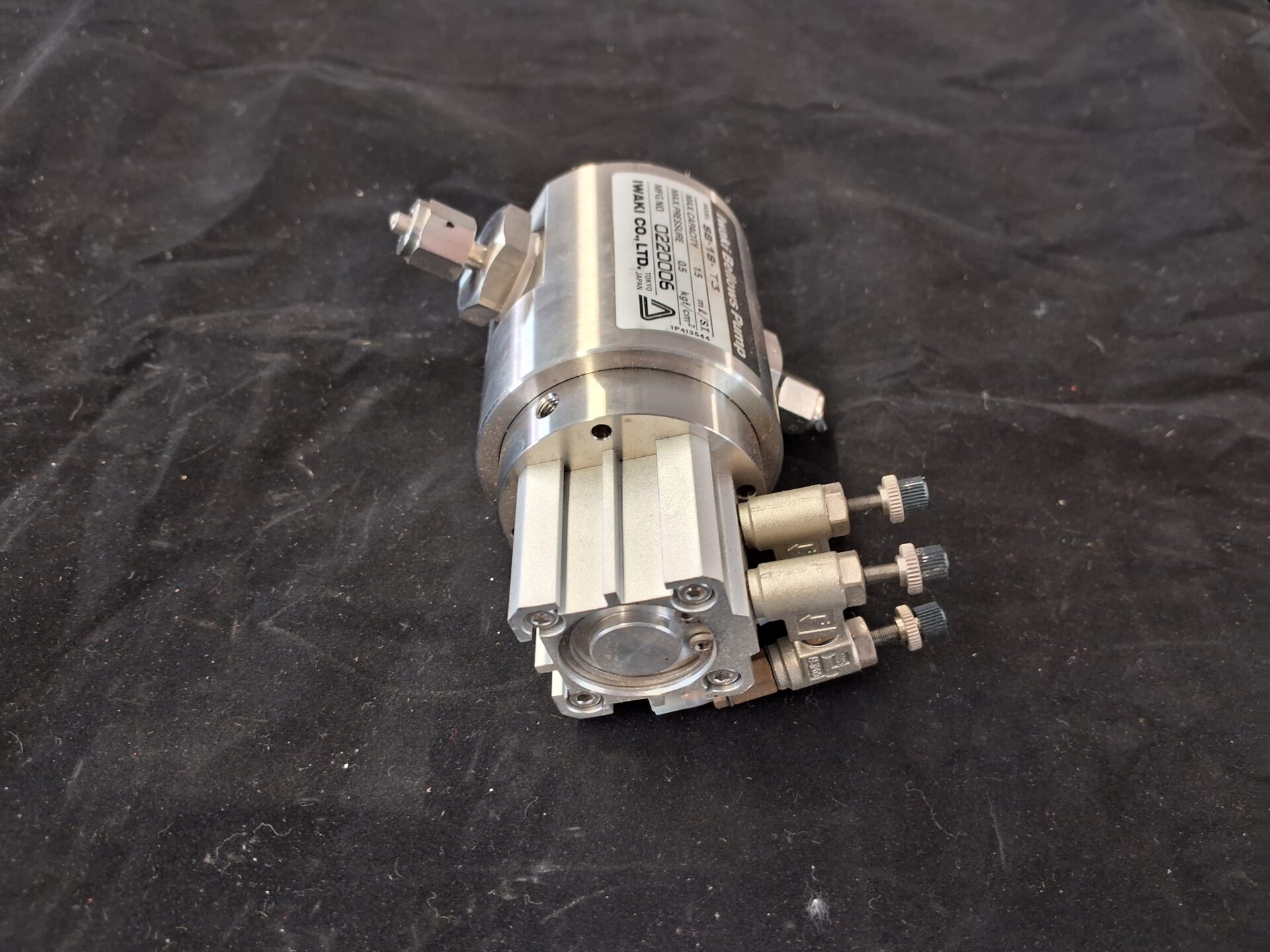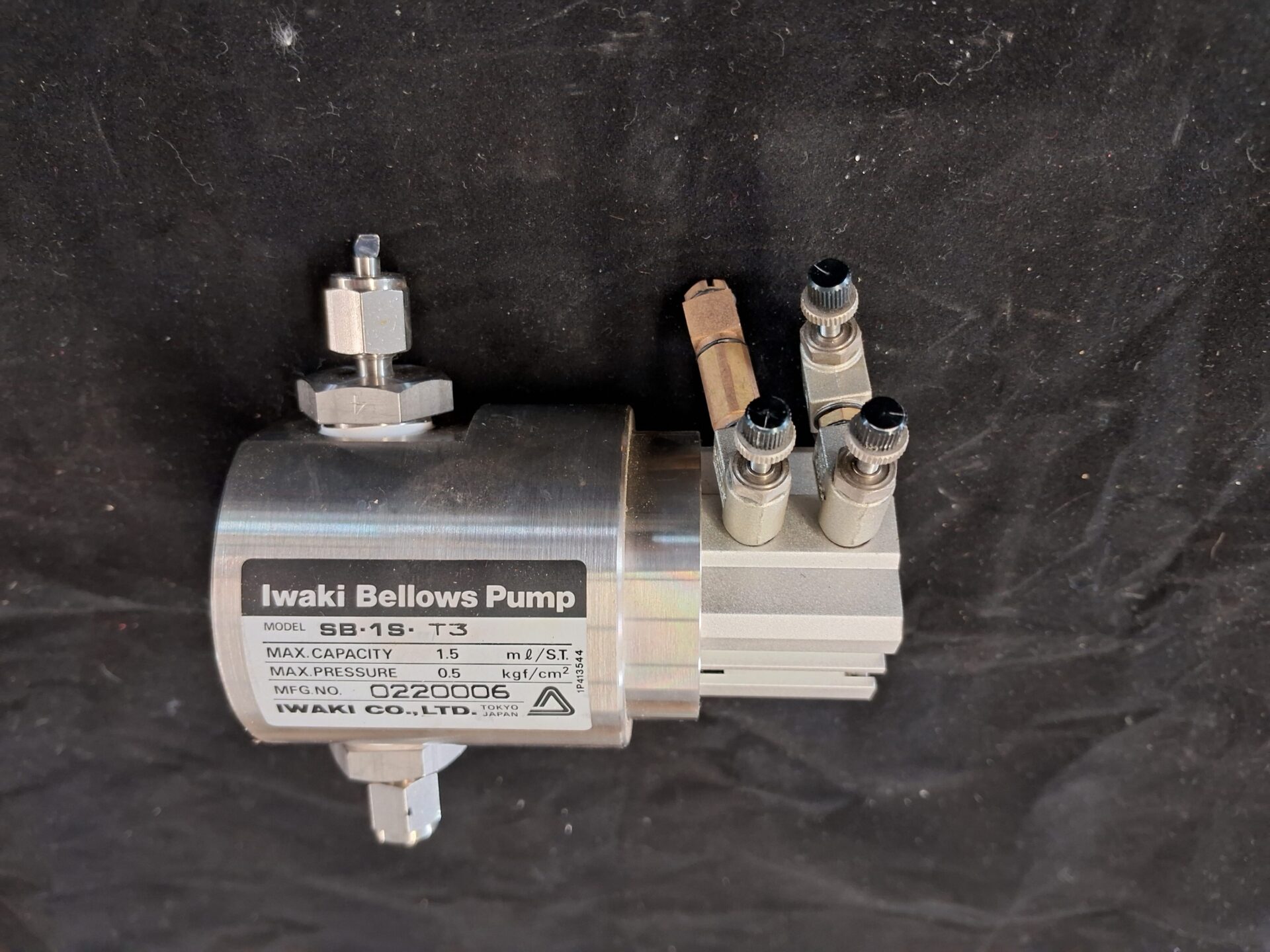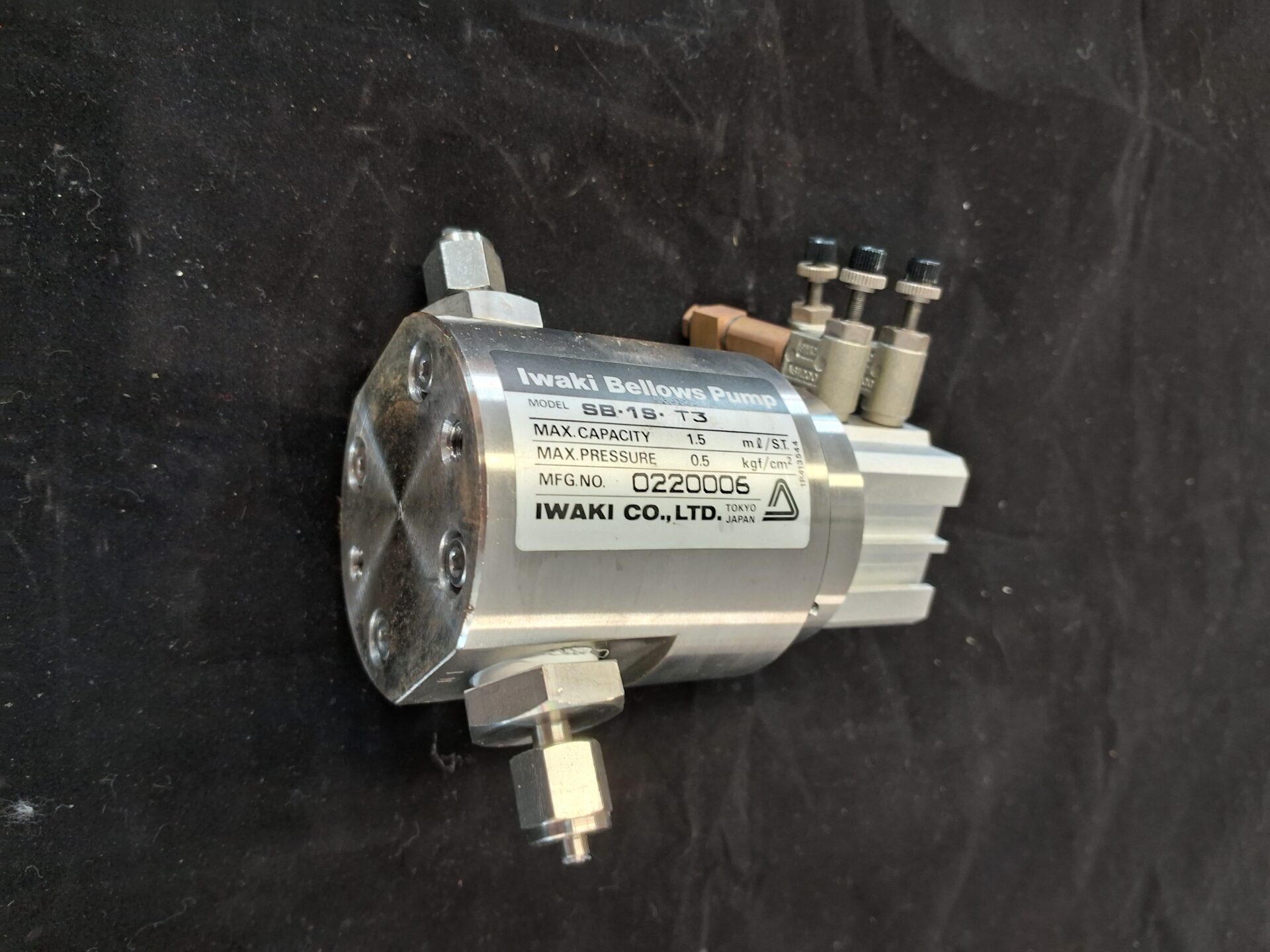 IWAKI SB-1S-T3 bellows pump, compact model for ultra-pure fluid dosing, chemical handling in semiconductor production, lab, or research. Max capacity: 1.5mL/stroke, max pressure: 0.5kg/cm². Pneumatic drive, small size, durable. Used, tested, working.