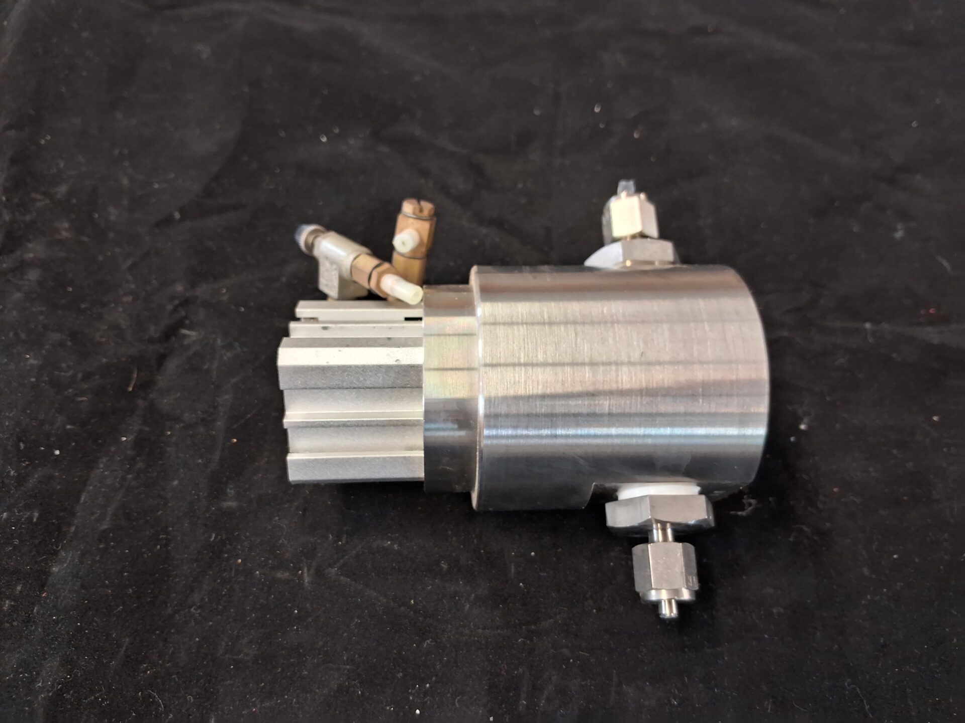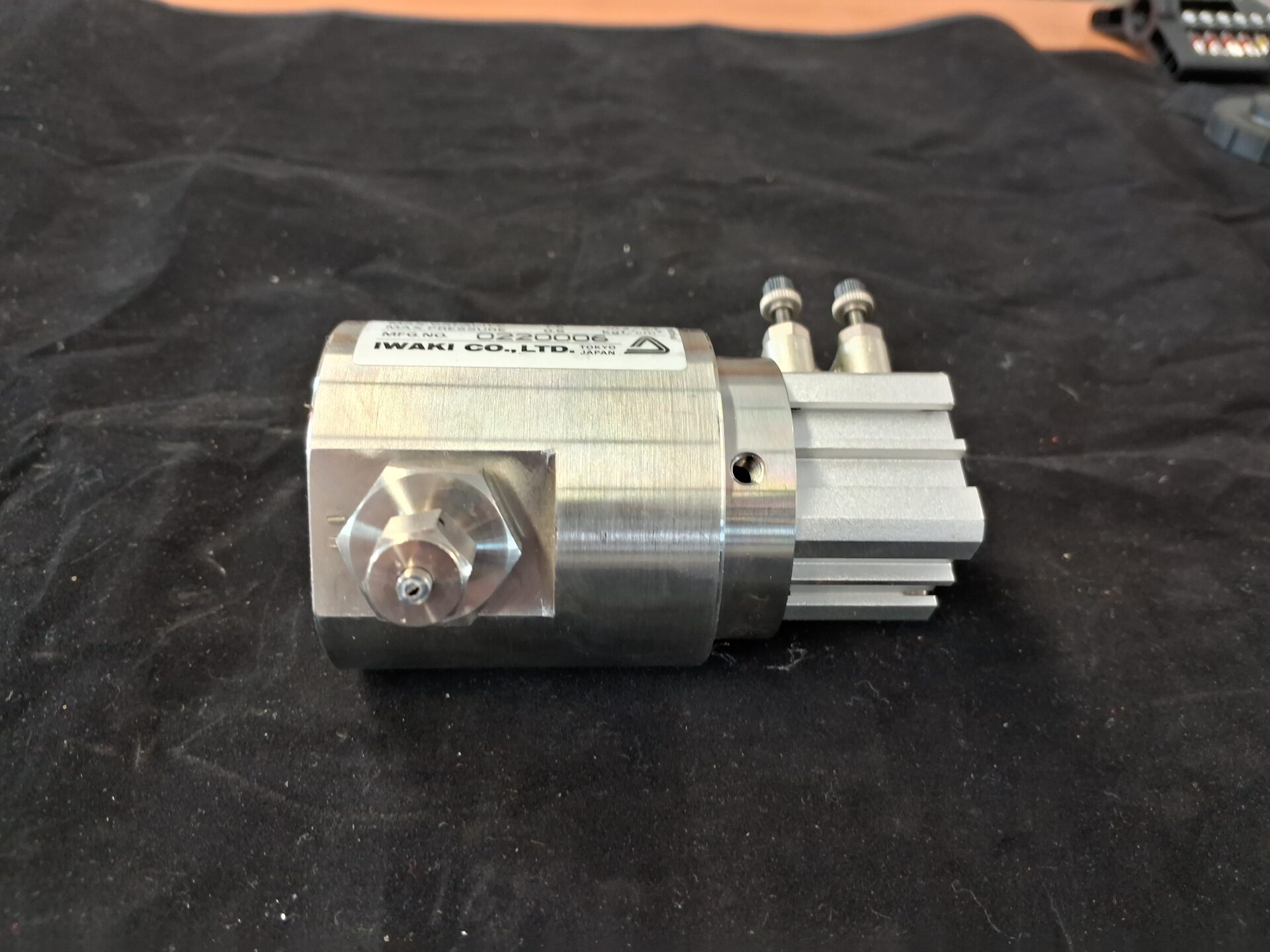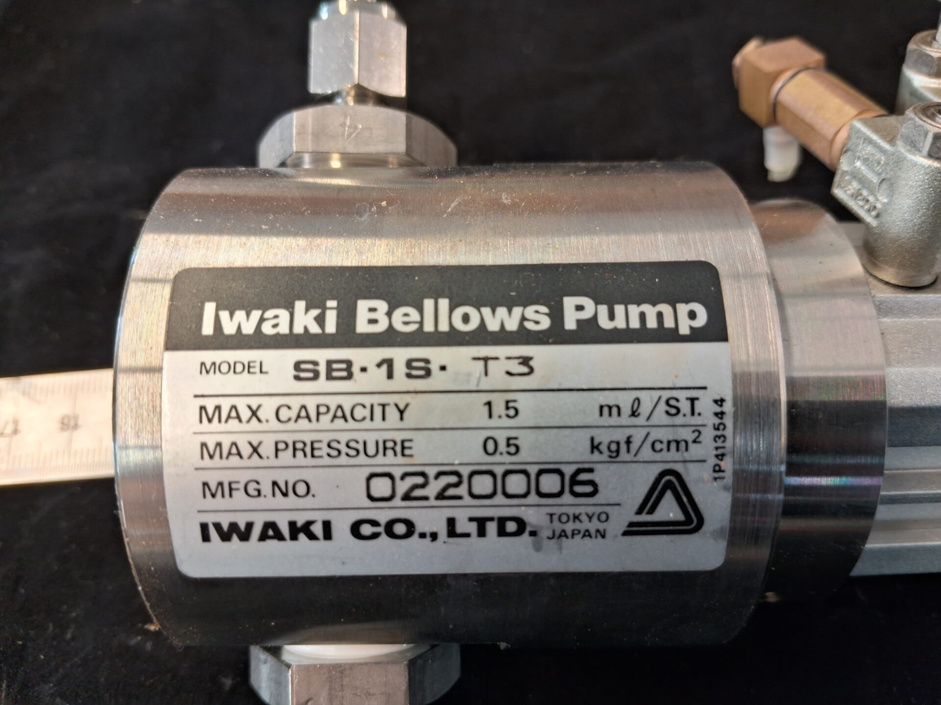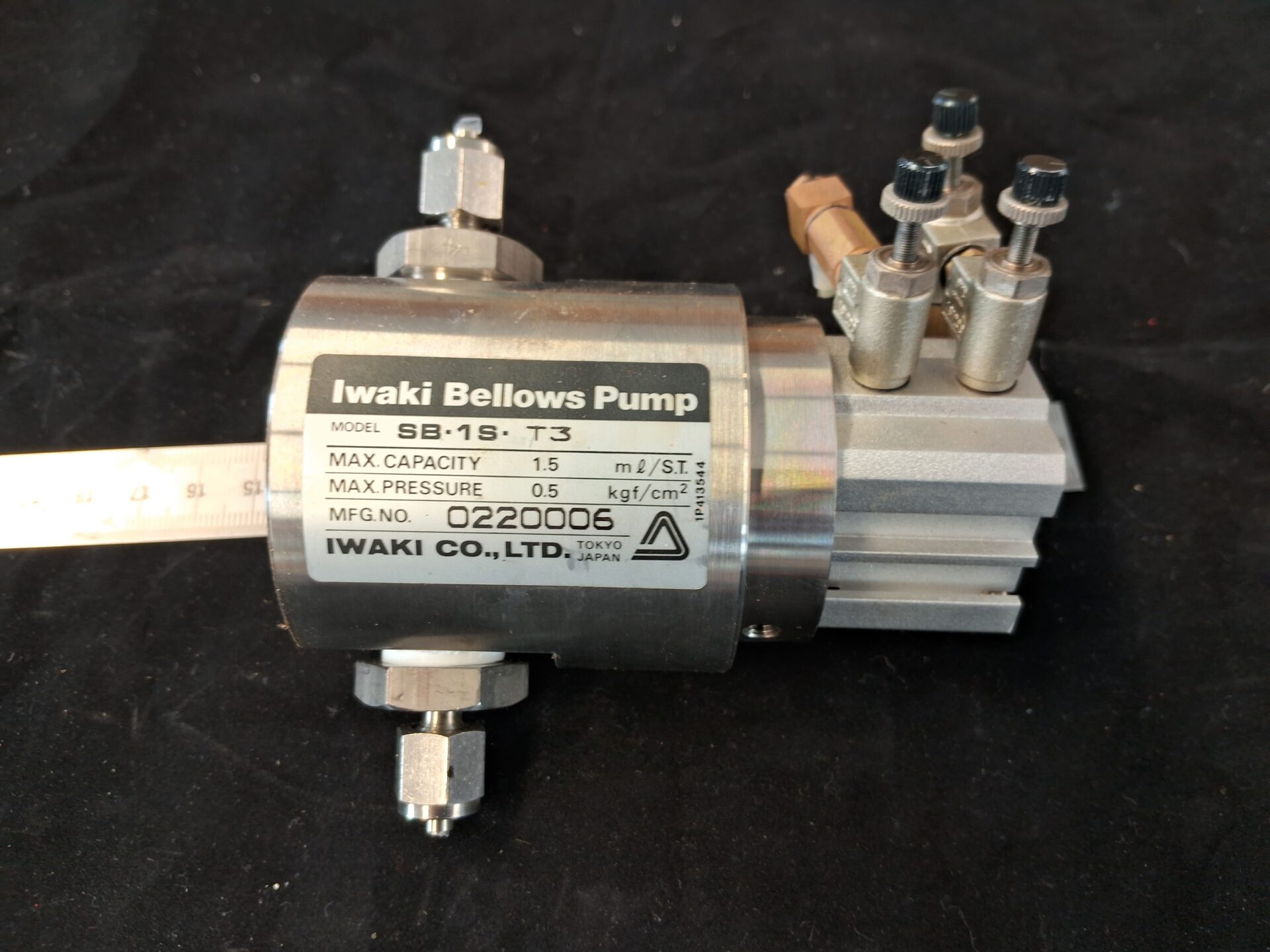IWAKI SB-1S-T3 bellows pump, compact model for ultra-pure fluid dosing, chemical handling in semiconductor production, lab, or research. Max capacity: 1.5mL/stroke, max pressure: 0.5kg/cm². Pneumatic drive, small size, durable. Used, tested, working.