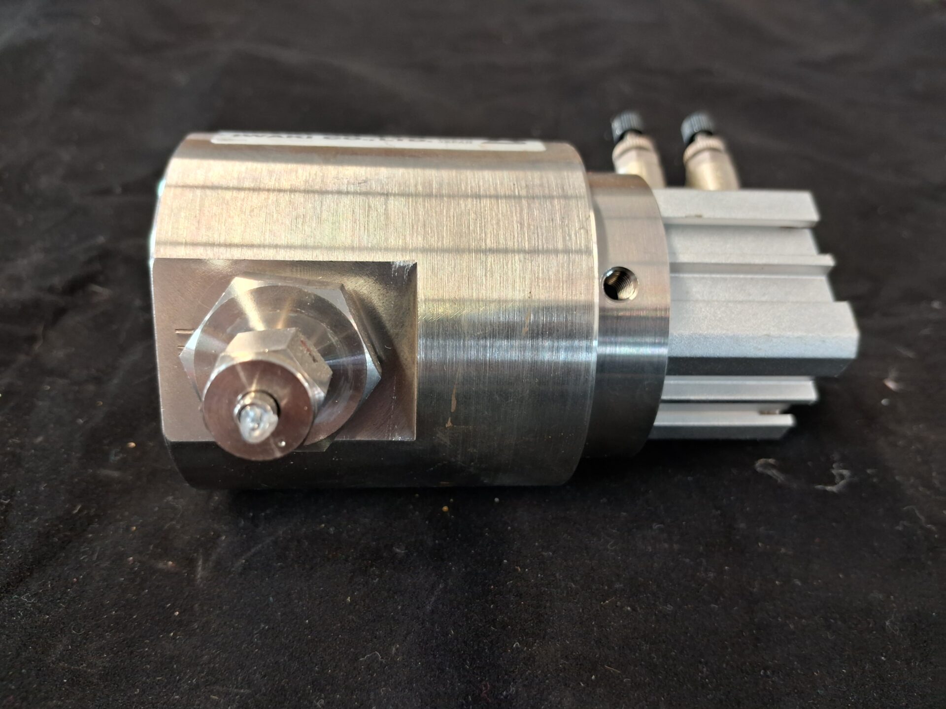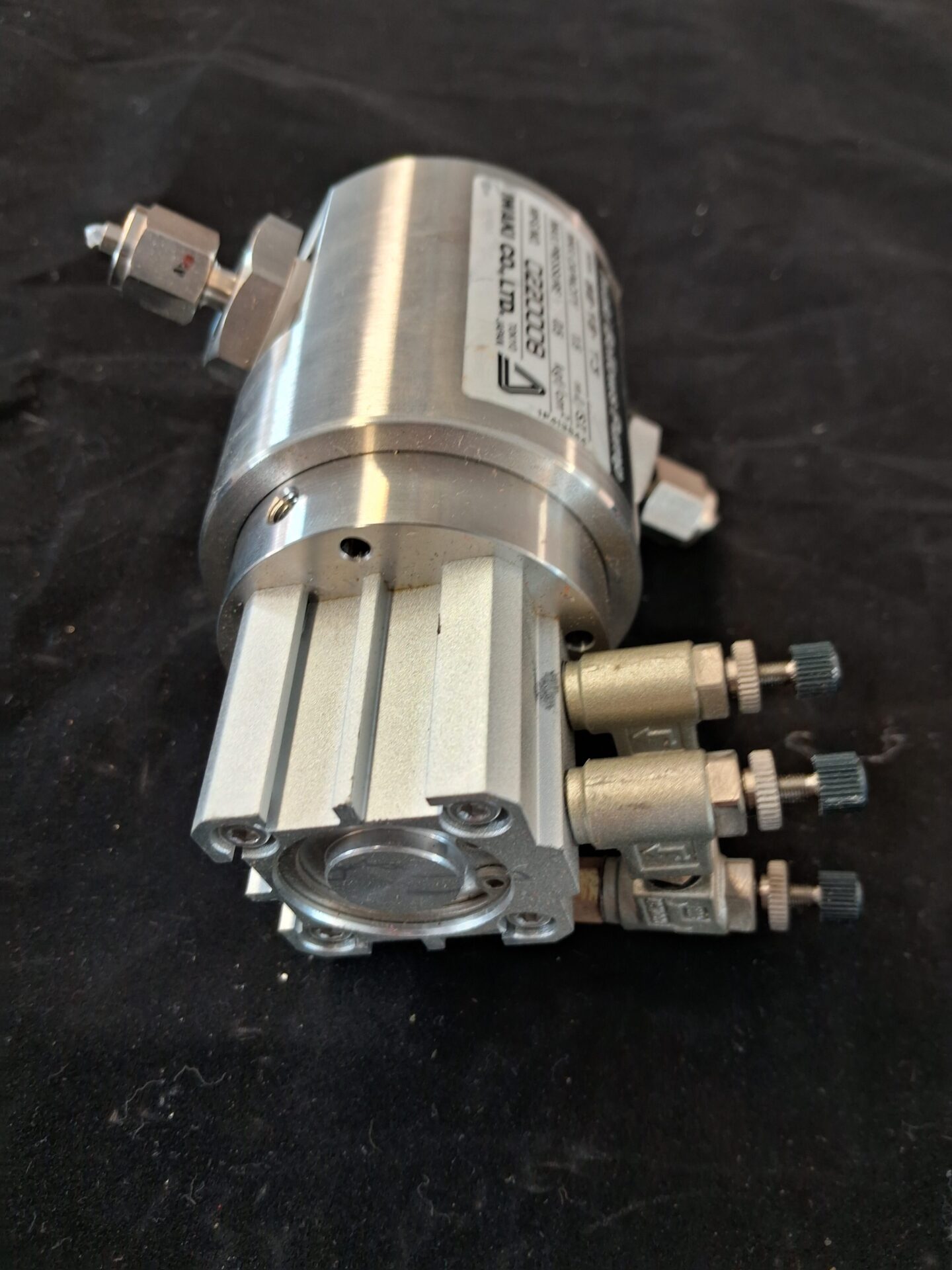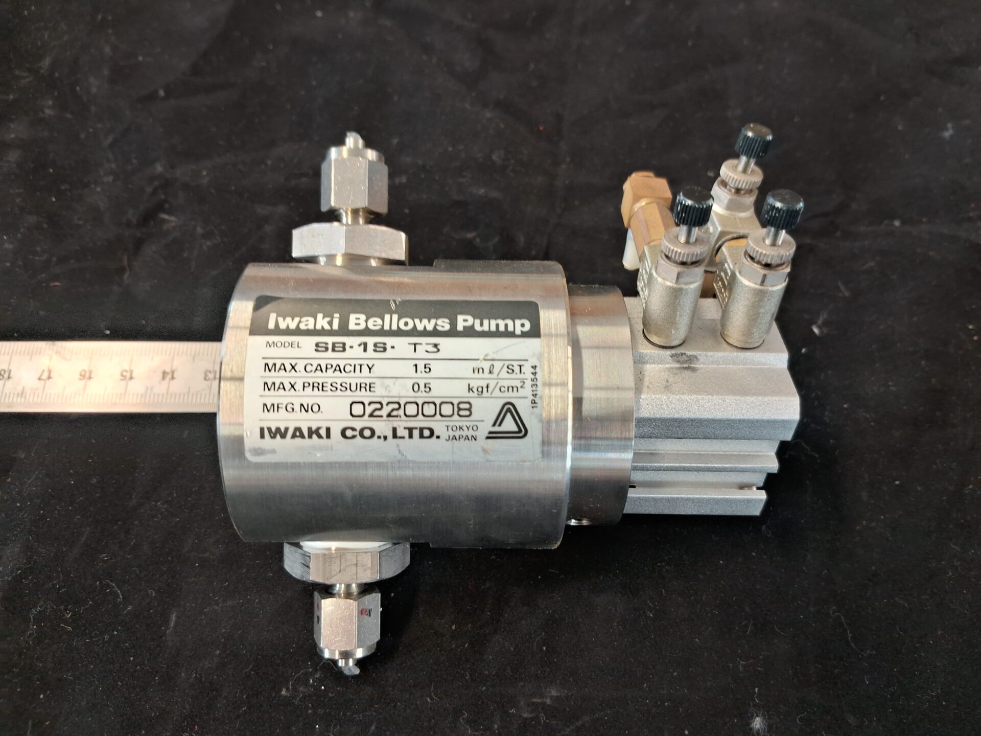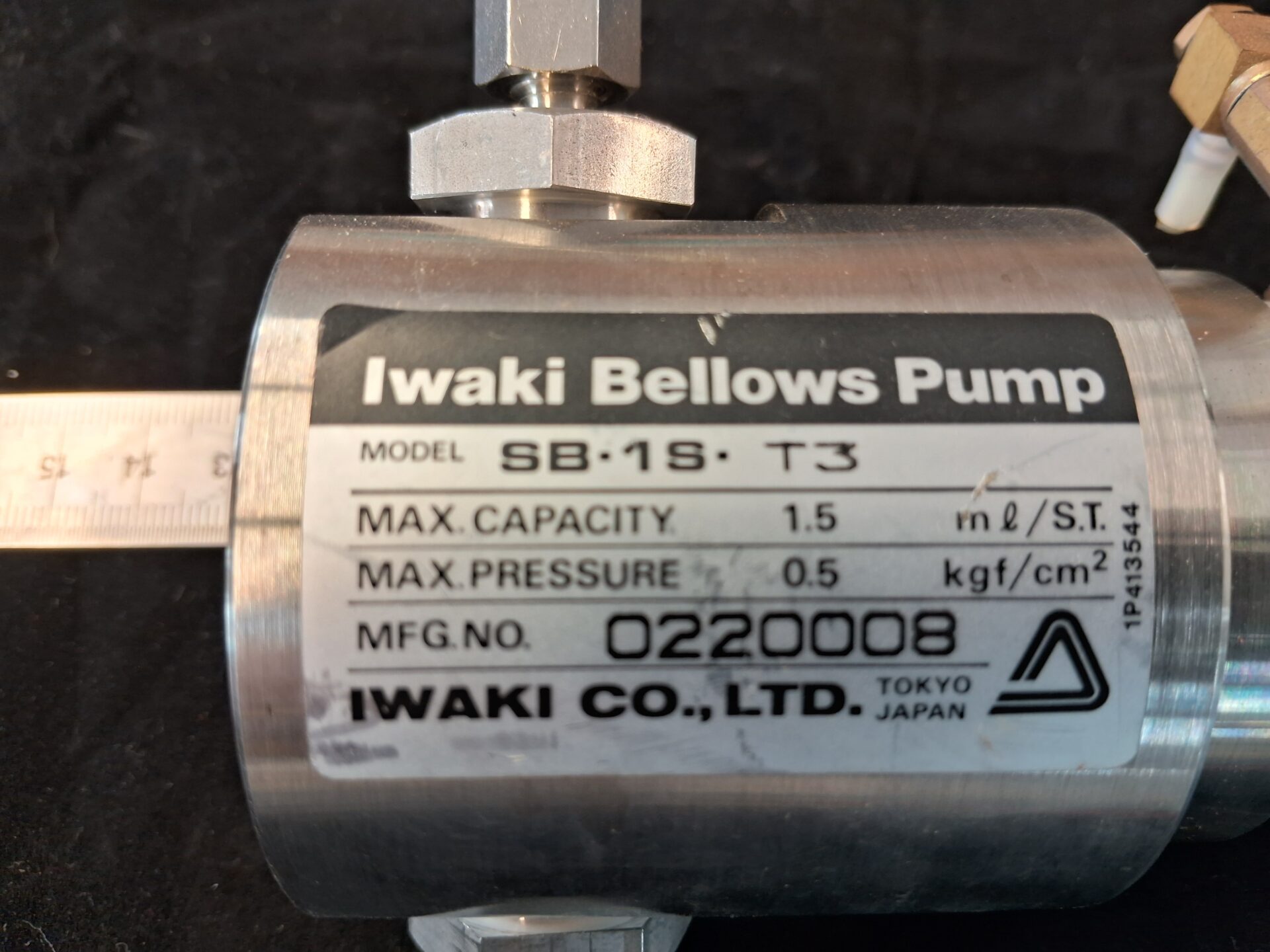 IWAKI SB-1S-T3 bellows pump, compact model for ultra-pure fluid dosing or chemical handling in semiconductor, lab, or research systems. Max. capacity: 1.5mL/stroke, max. pressure: 0.5kg/cm². Robust pneumatic drive, small footprint. Used, tested, functional.