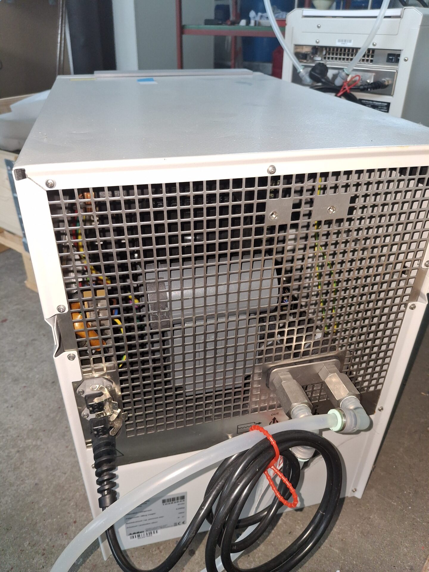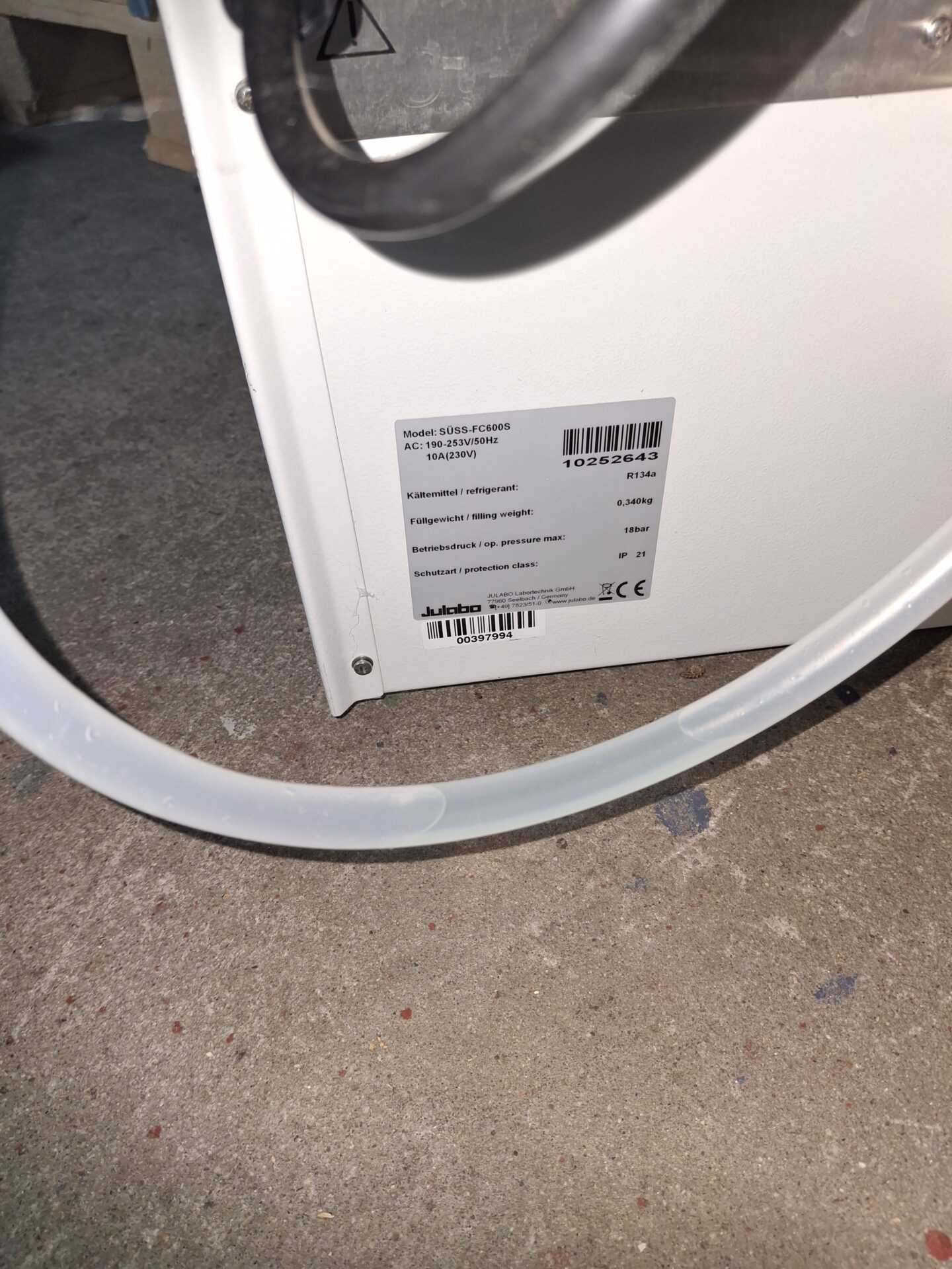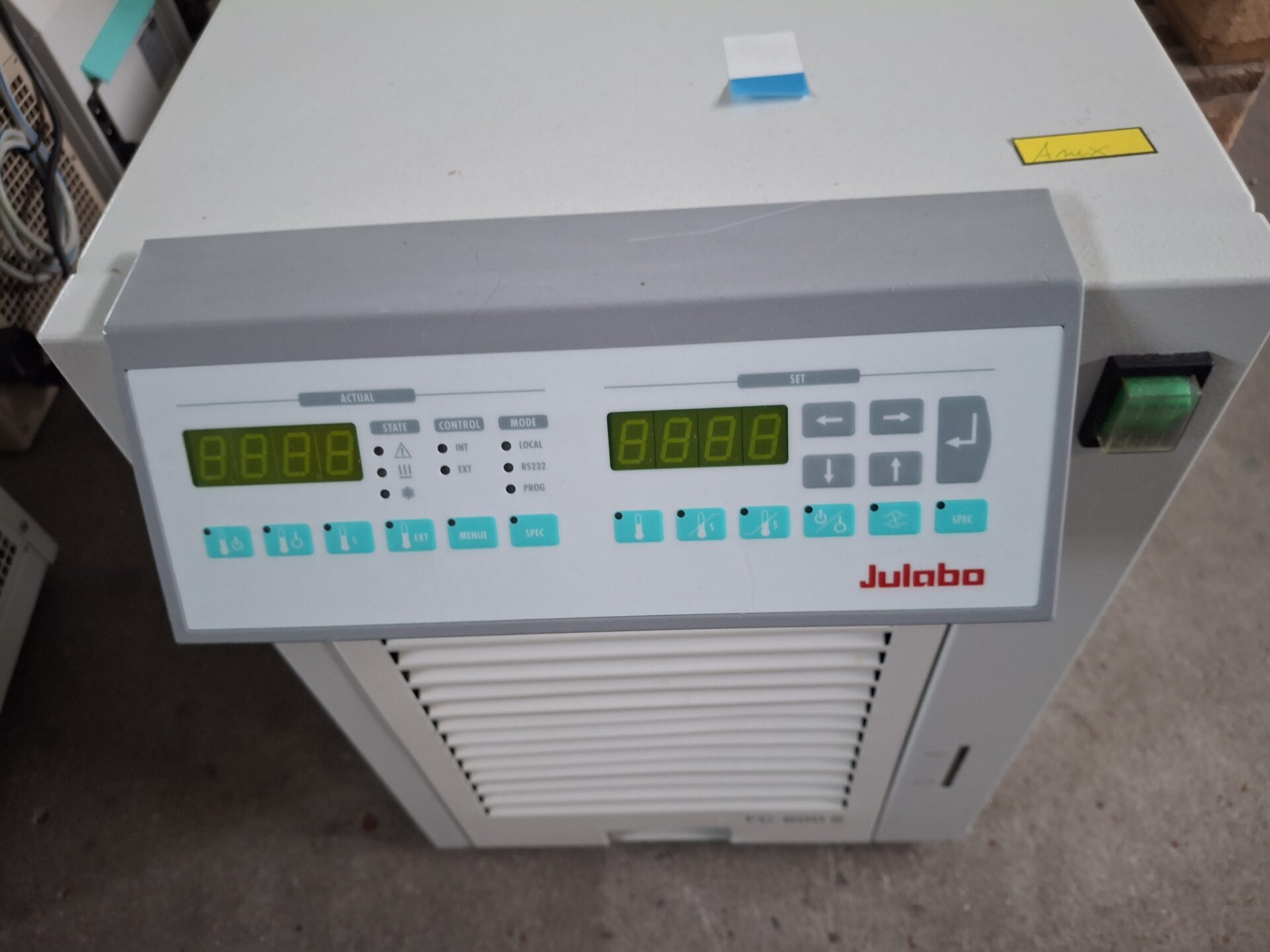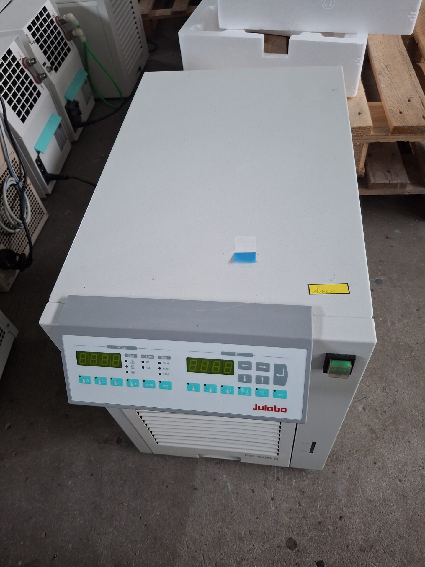 Used Julabo FC600S recirculating chiller, built for precision laboratory and industrial cooling. Features temperature range of -10°C to +80°C, cooling capacity up to 0.5kW at +20°C, integrated 1.2kW heater, 22L/min flow rate, 6-8L filling volume, R134a refrigerant, compact design, digital dual LED display, and RS232 interface. Item tested and fully functional; signs of handling present.