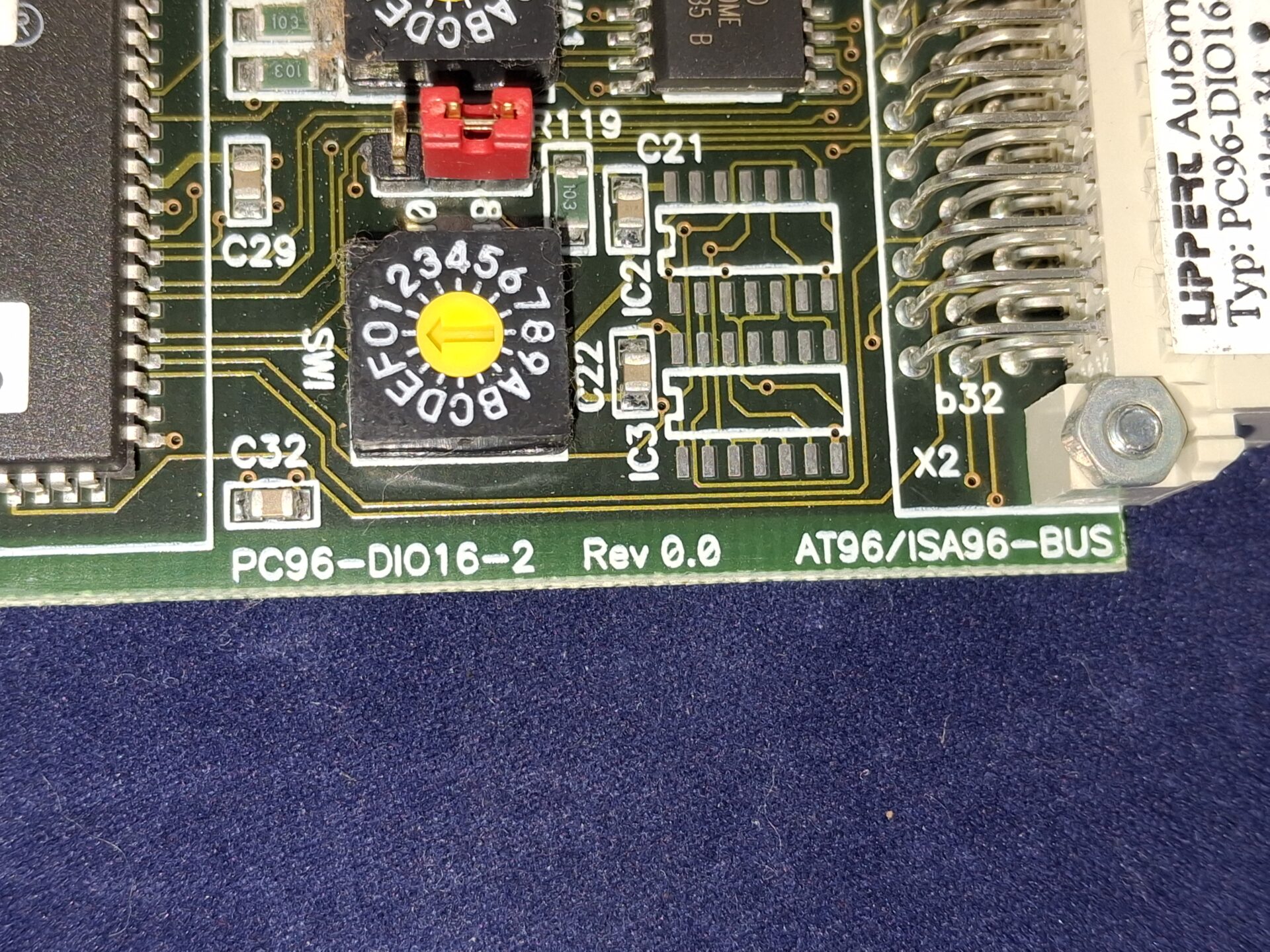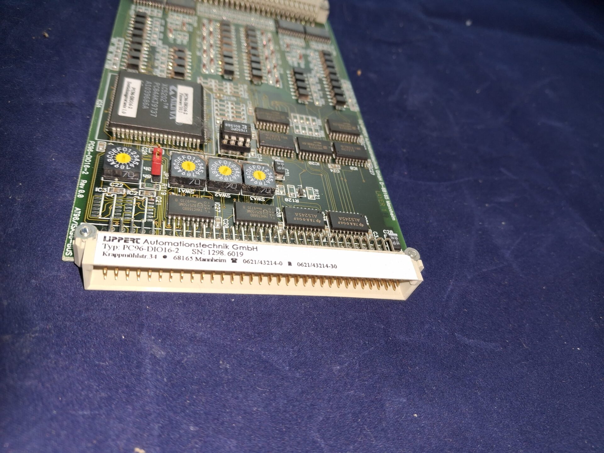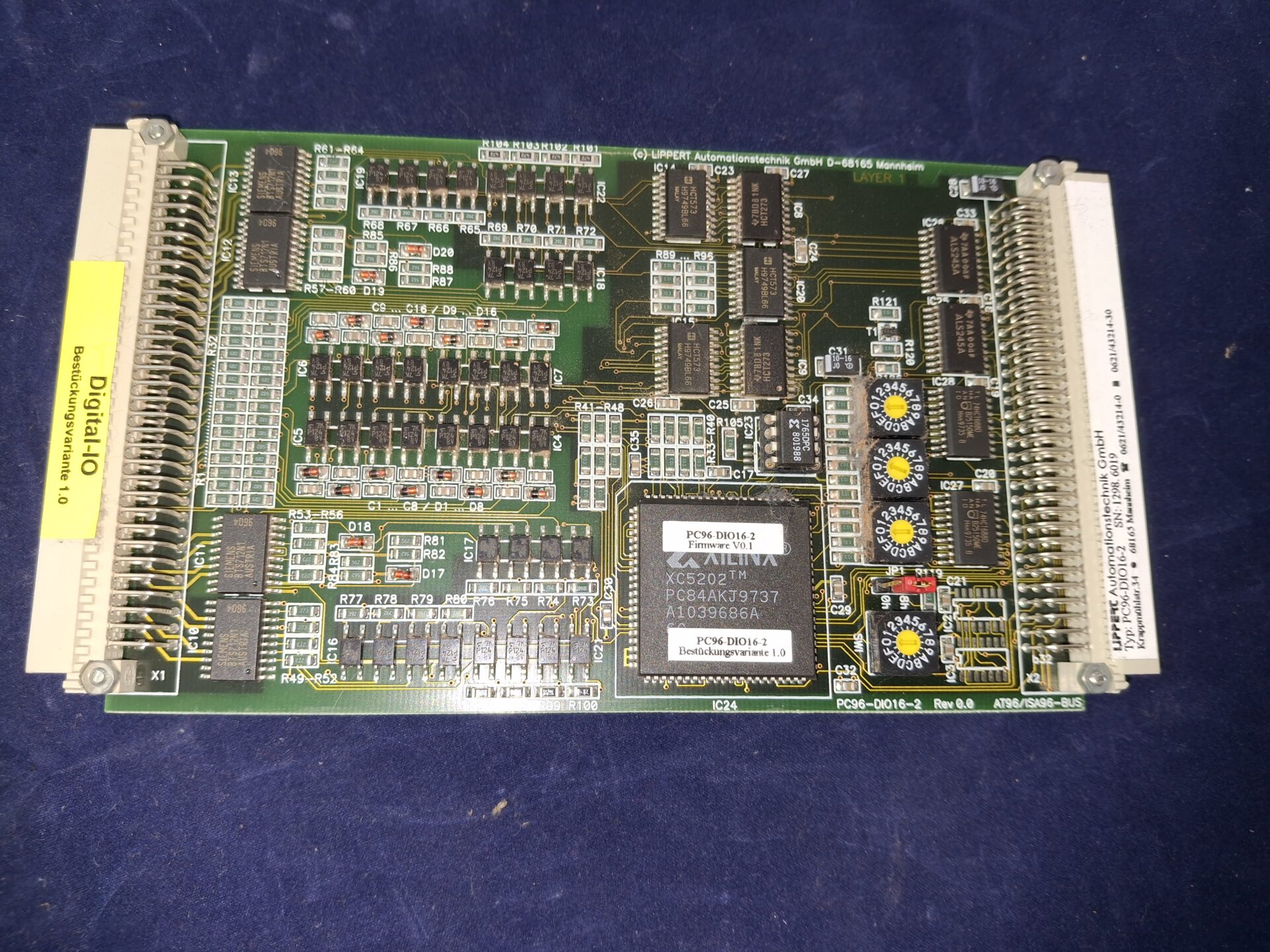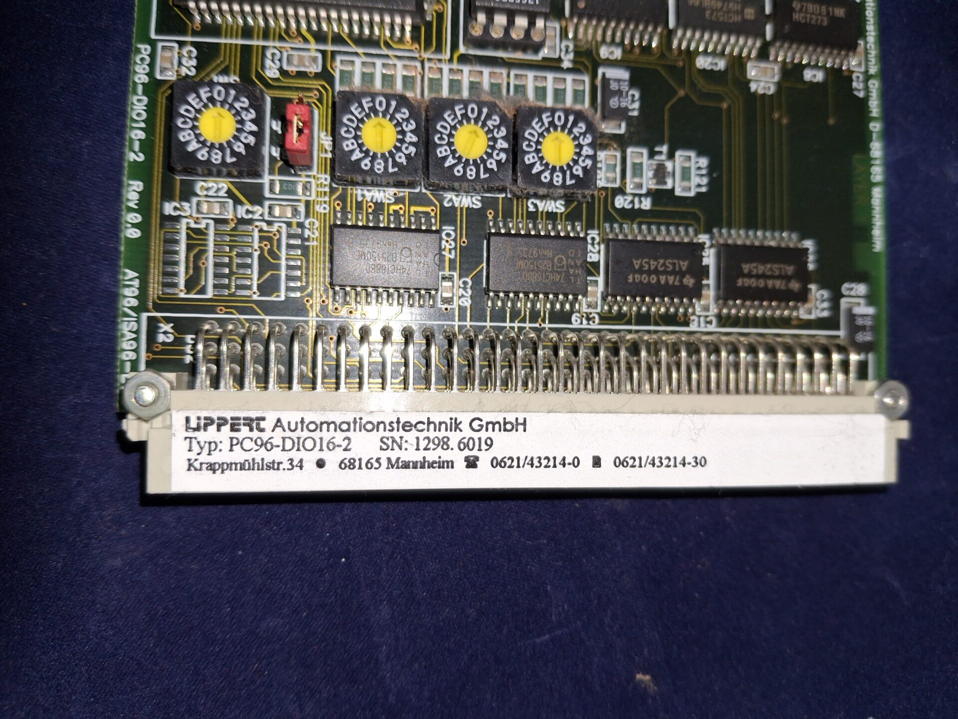 Lippert Automationstechnik GmbH PC96-DIO16-2 digital input/output board, AT96/ISA96 bus, Rev 0.0, suitable for PLC/process automation. Some cosmetic wear from previous use, surplus item.