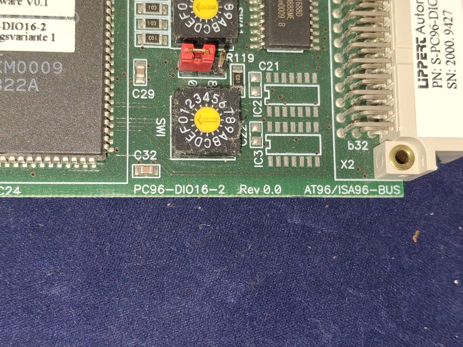 Used Lippert Automationstechnik S-PC96-DIO16-2 digital input/output I/O board (AT96/ISA96 bus, Bestückungsvariante 1.0, Rev 0.0), industrial automation/PLC expansion module. SN: 2000.9427. Typical cosmetic wear for surplus, tested for signal continuity only.