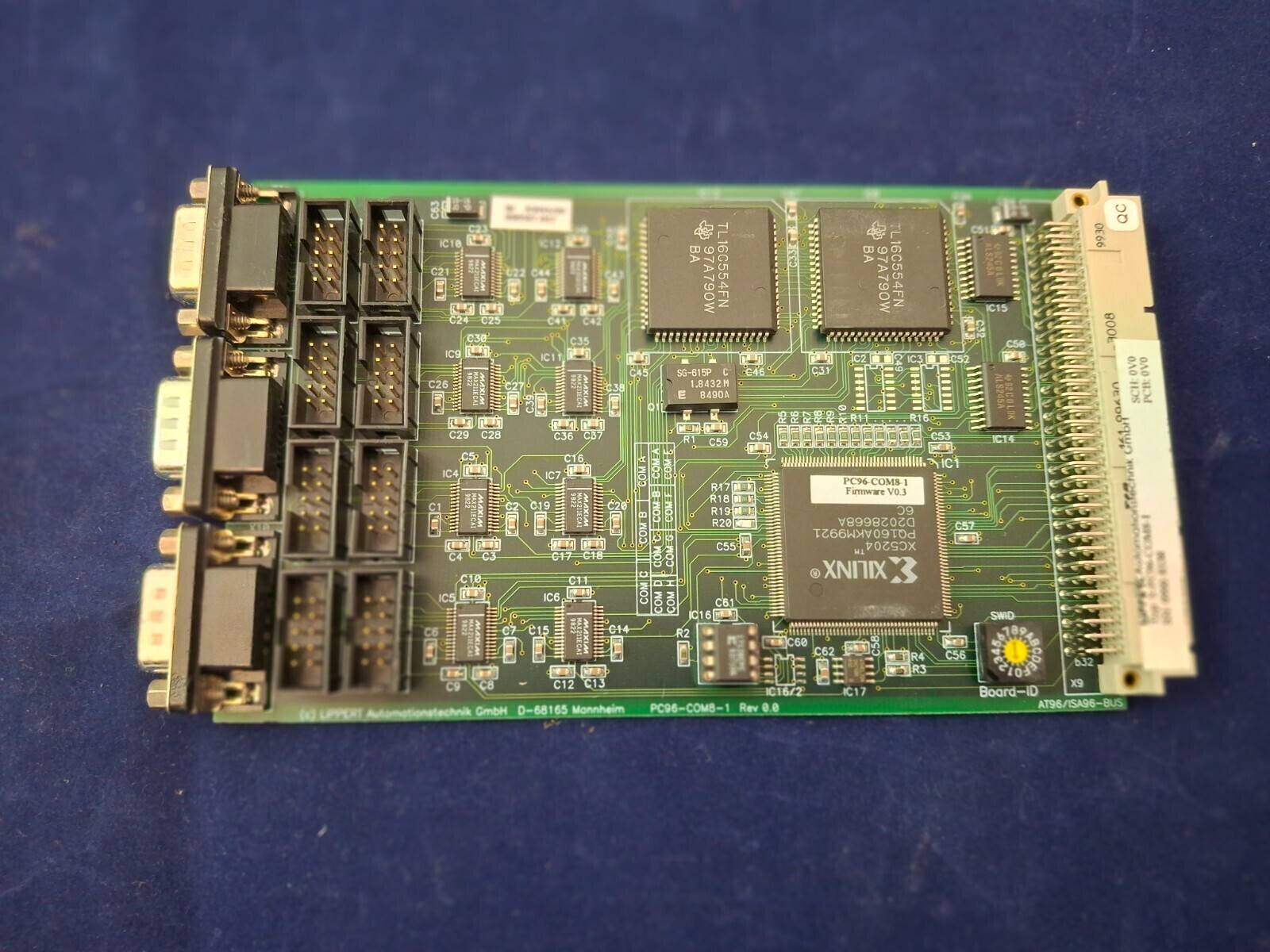 Board shows normal signs of previous use, no burned components visible, and is sold as used industrial electronics for spare parts or replacement in existing installations. Exact front labeling: “LIPPERT Automationstechnik GmbH D-68165 Mannheim PC96-COM8-1 Rev 0.0”, side label “Typ: S-PC96-COM8-1, SCH: 0V0, PCB: 0V0, SN: 0900.8338”. Suitable for buyers needing a replacement LIPPERT PC96-COM8-1 communication card or compatible PC/104-Plus / PC96 style serial expansion.
