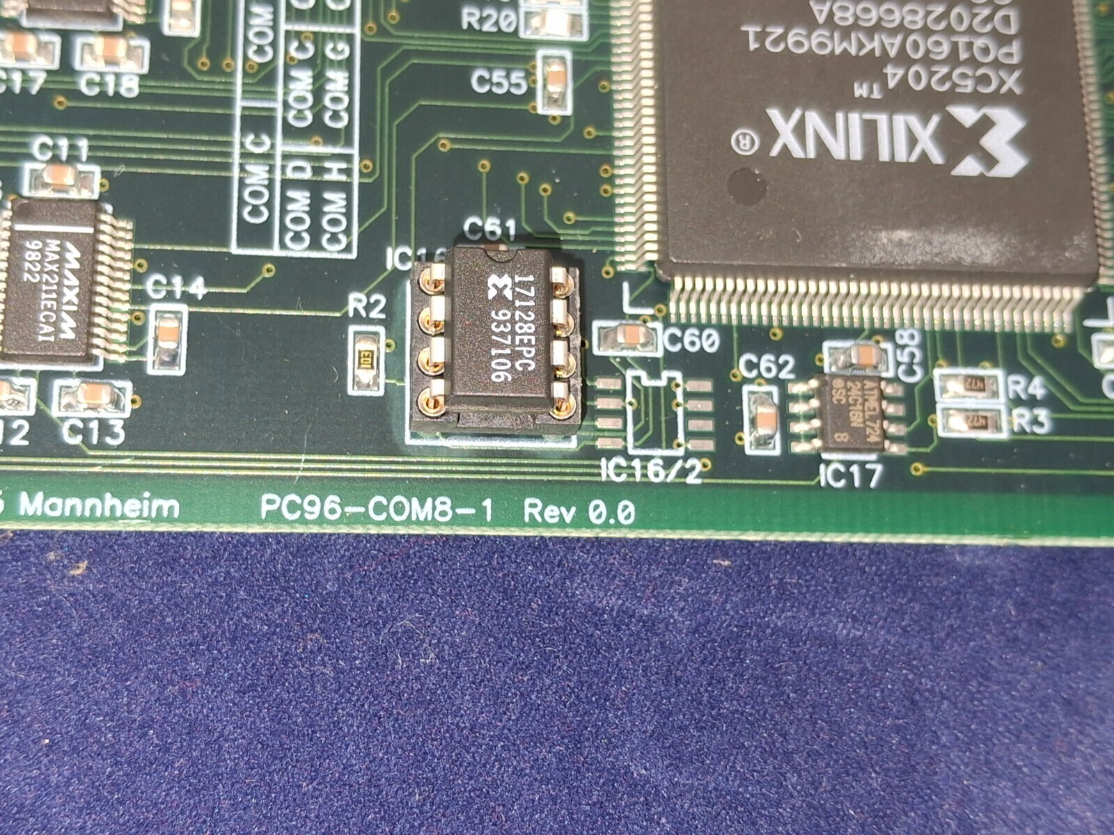 LIPPERT Automations­technik PC96-COM8-1 industrial communication board with 8 serial COM ports, ISA/96 bus edge connector and MAXIM transceivers, ideal for legacy PLC, automation and machine control systems. Visible IC markings include Xilinx FPGA, TL16C554FN UARTs and MAXIM MAX232-family drivers, confirming multi-channel RS-232 style serial I/O functionality.