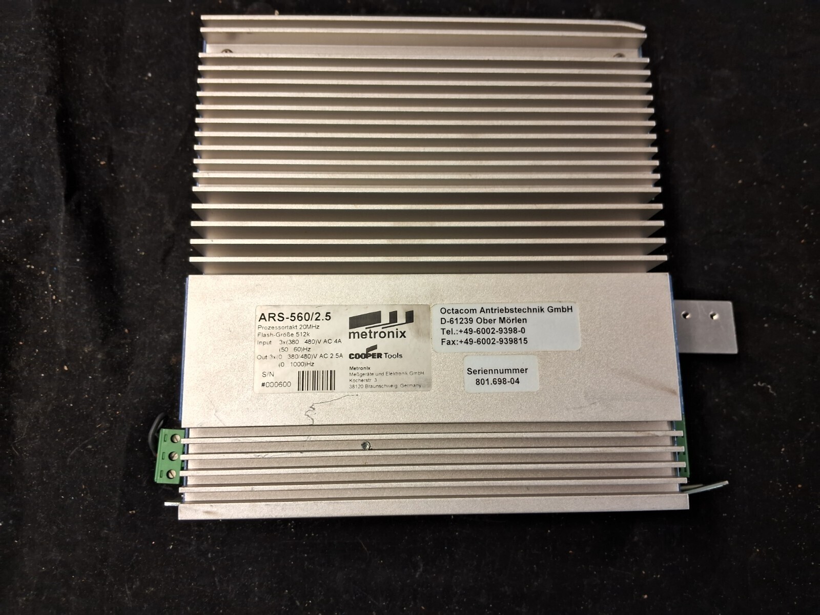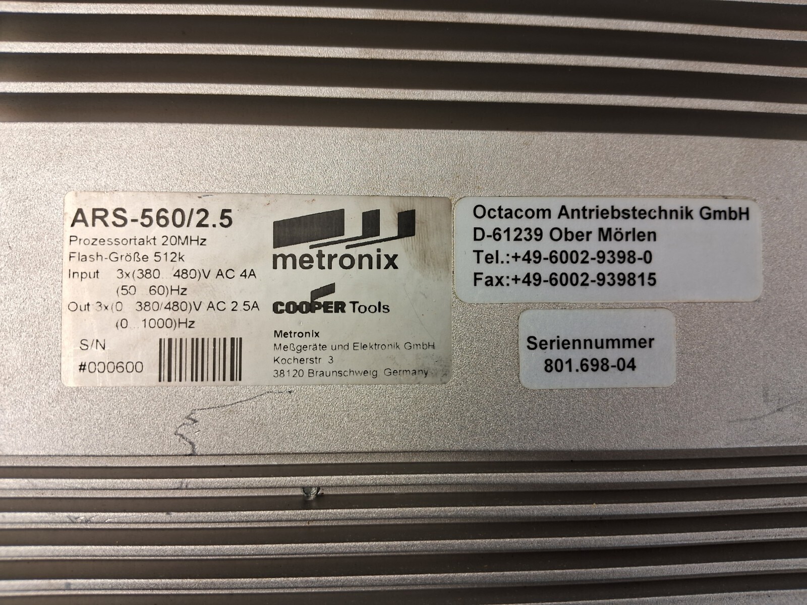 Used Metronix ARS-560/2.5 servo drive from Cooper Tools with 3x 380-480V AC input, 3x 0-380/480V AC 2.5A output and up to 1000Hz, ideal replacement industrial motion controller.