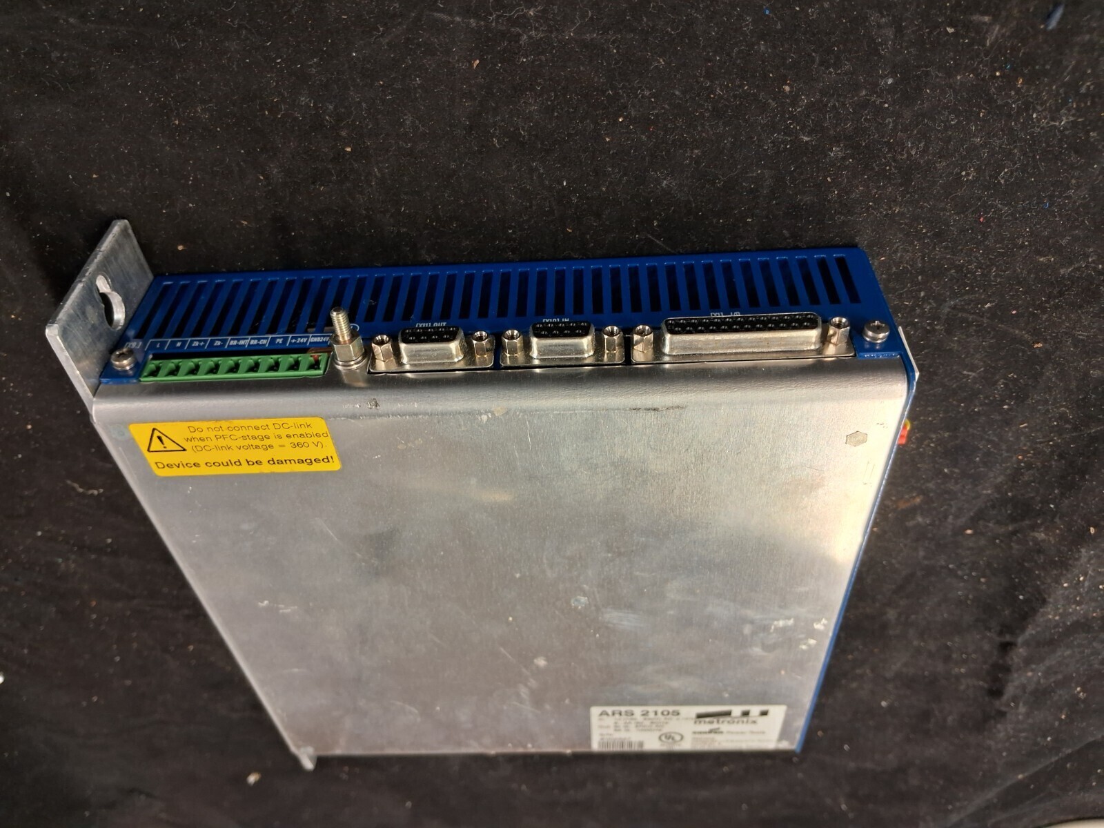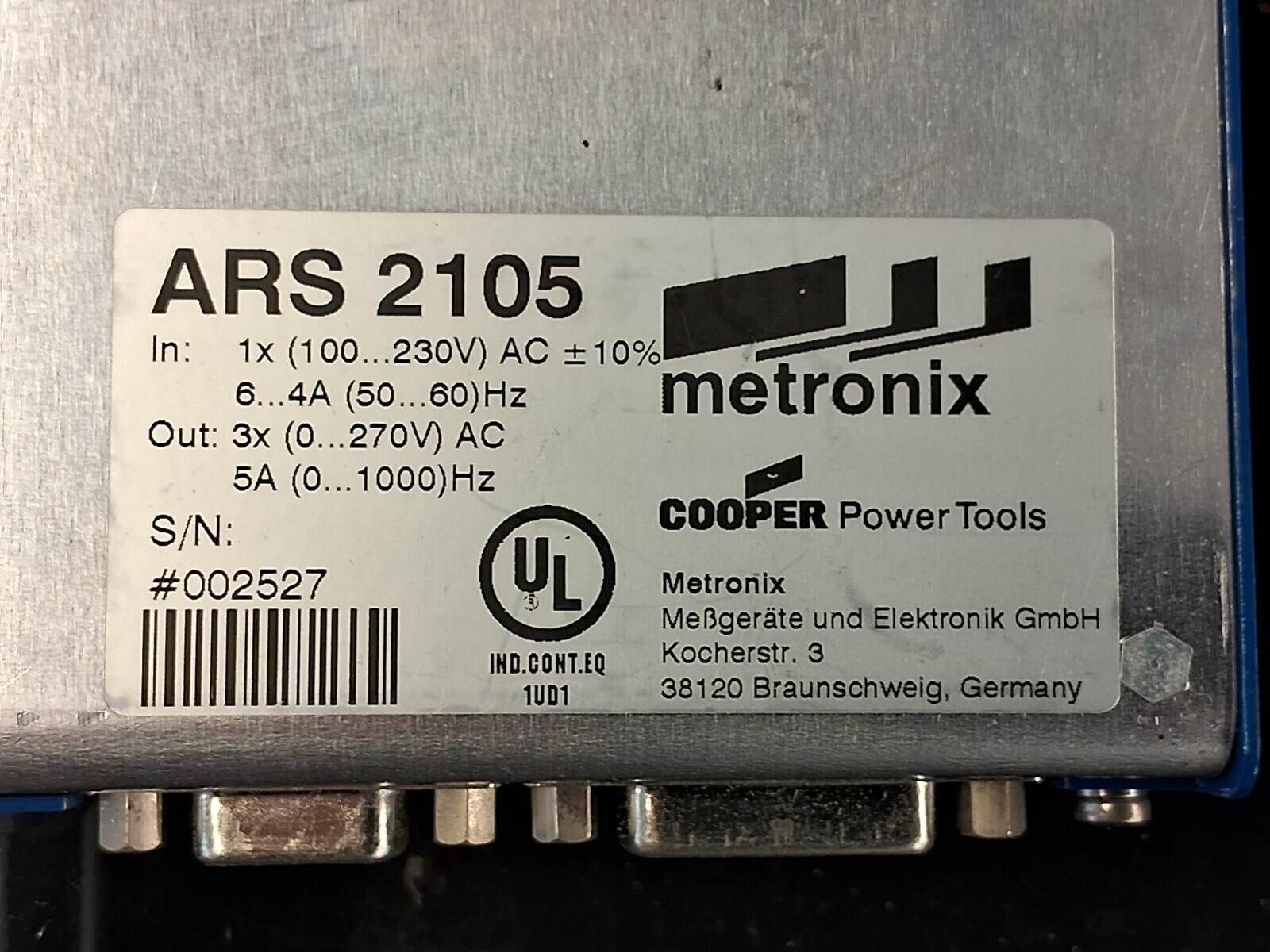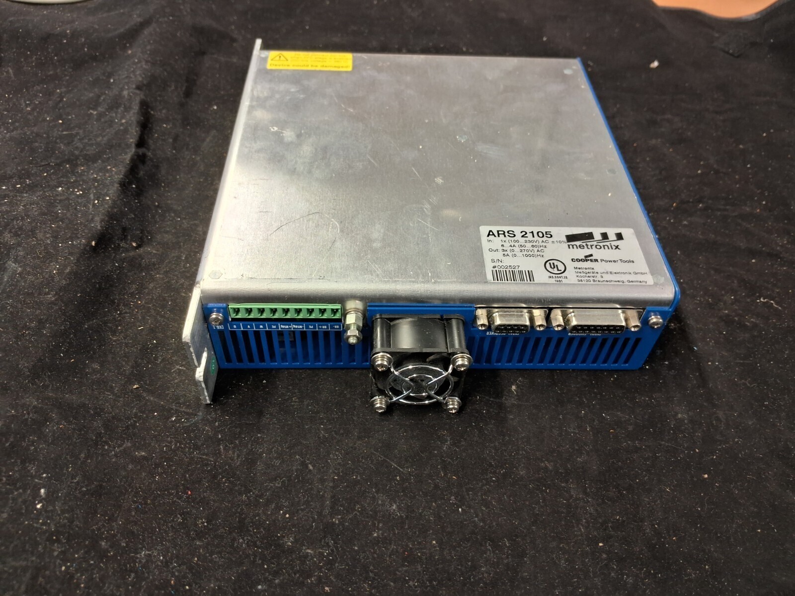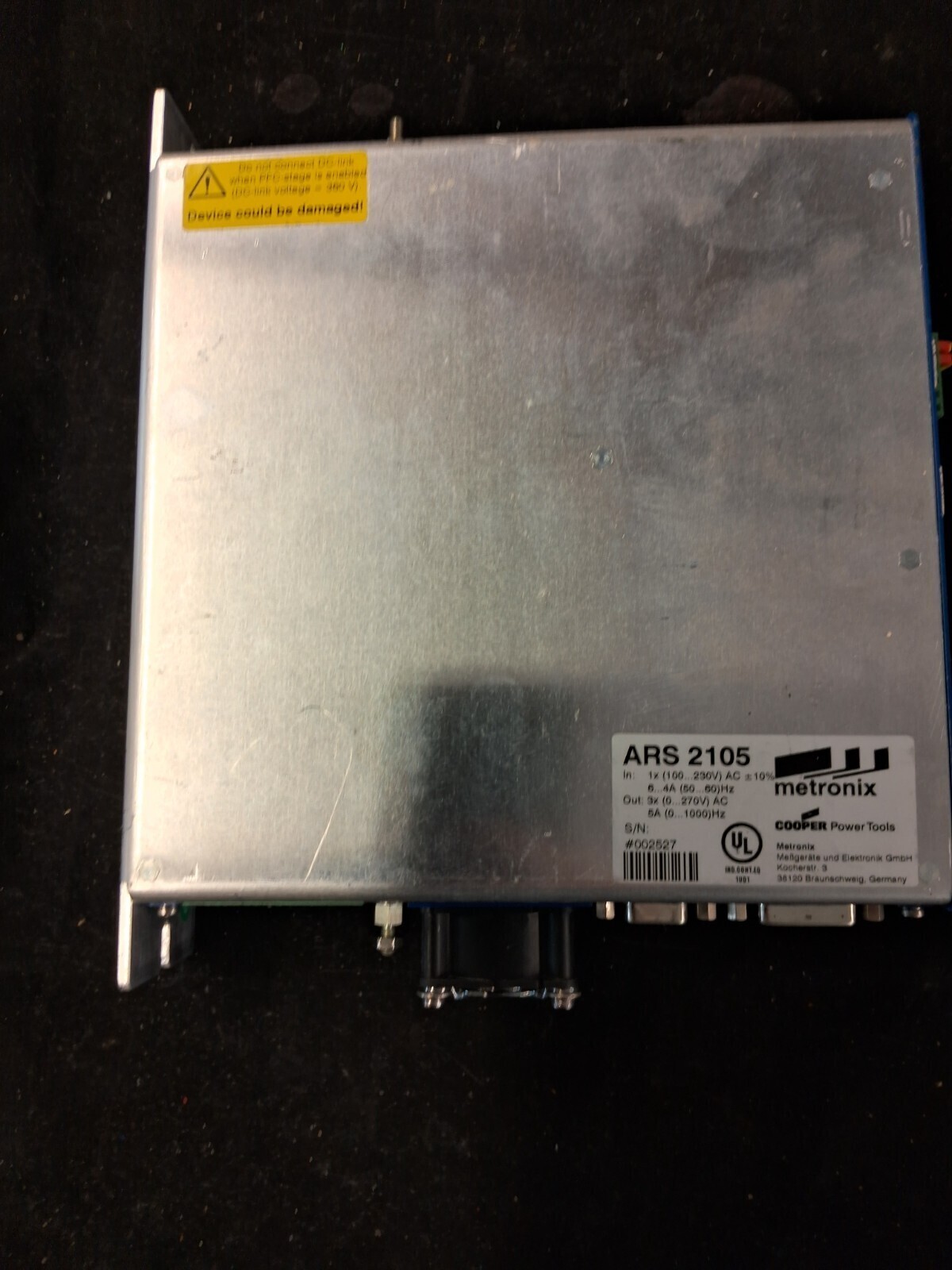 Used Metronix ARS 2105 servo positioning controller with 1x 100-230V AC input, 3x 0-270V AC 5A output and up to 1000Hz, ideal replacement industrial servo controller for motion control systems.