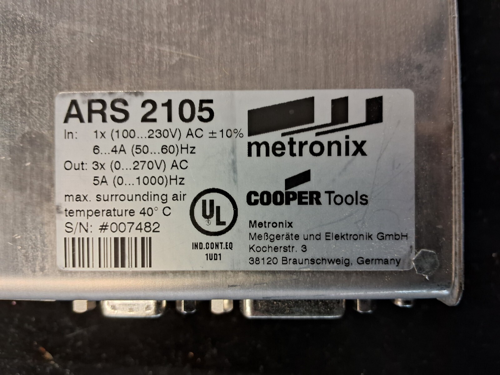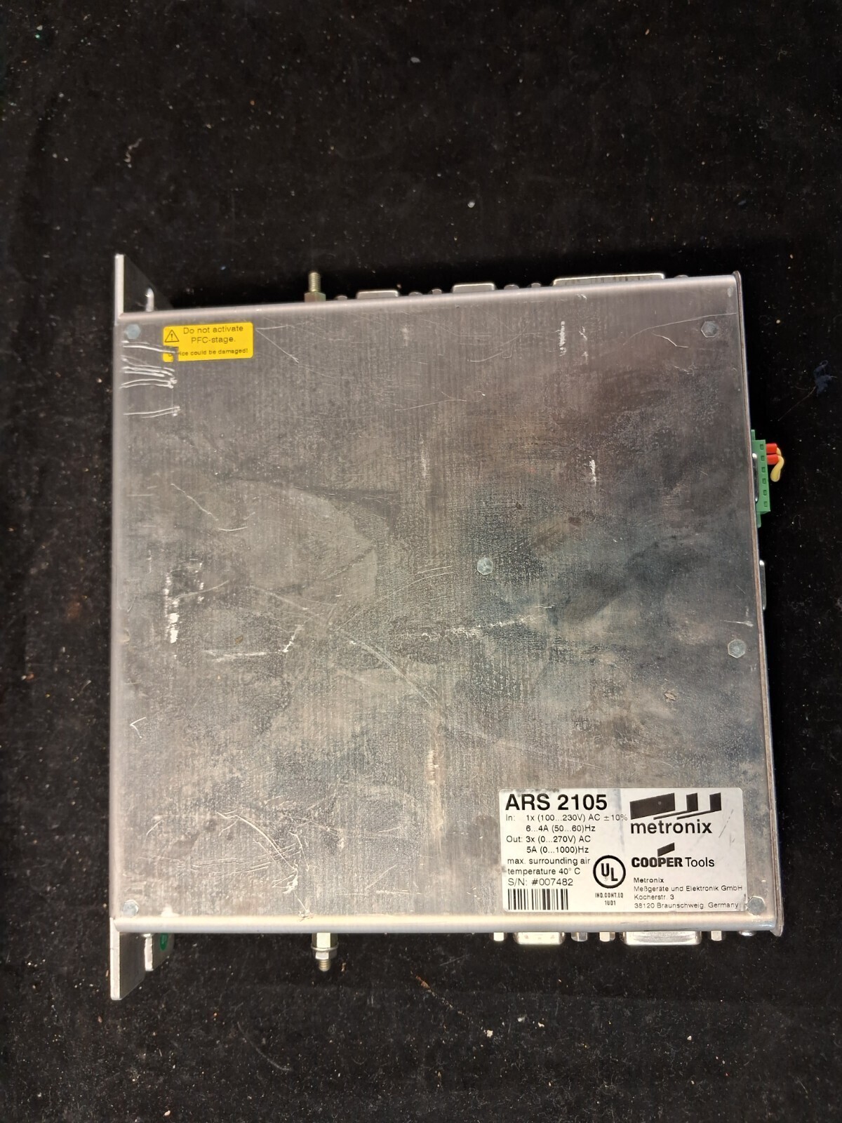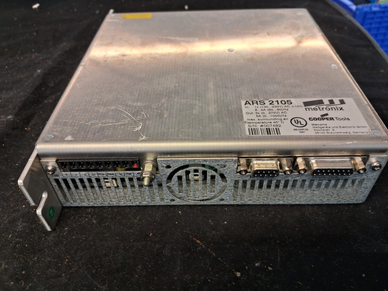 Used Metronix ARS 2105 servo positioning controller with 1x 100-230V AC input, 3x 0-270V AC 5A output and up to 1000Hz, ideal replacement industrial servo controller for motion control systems.