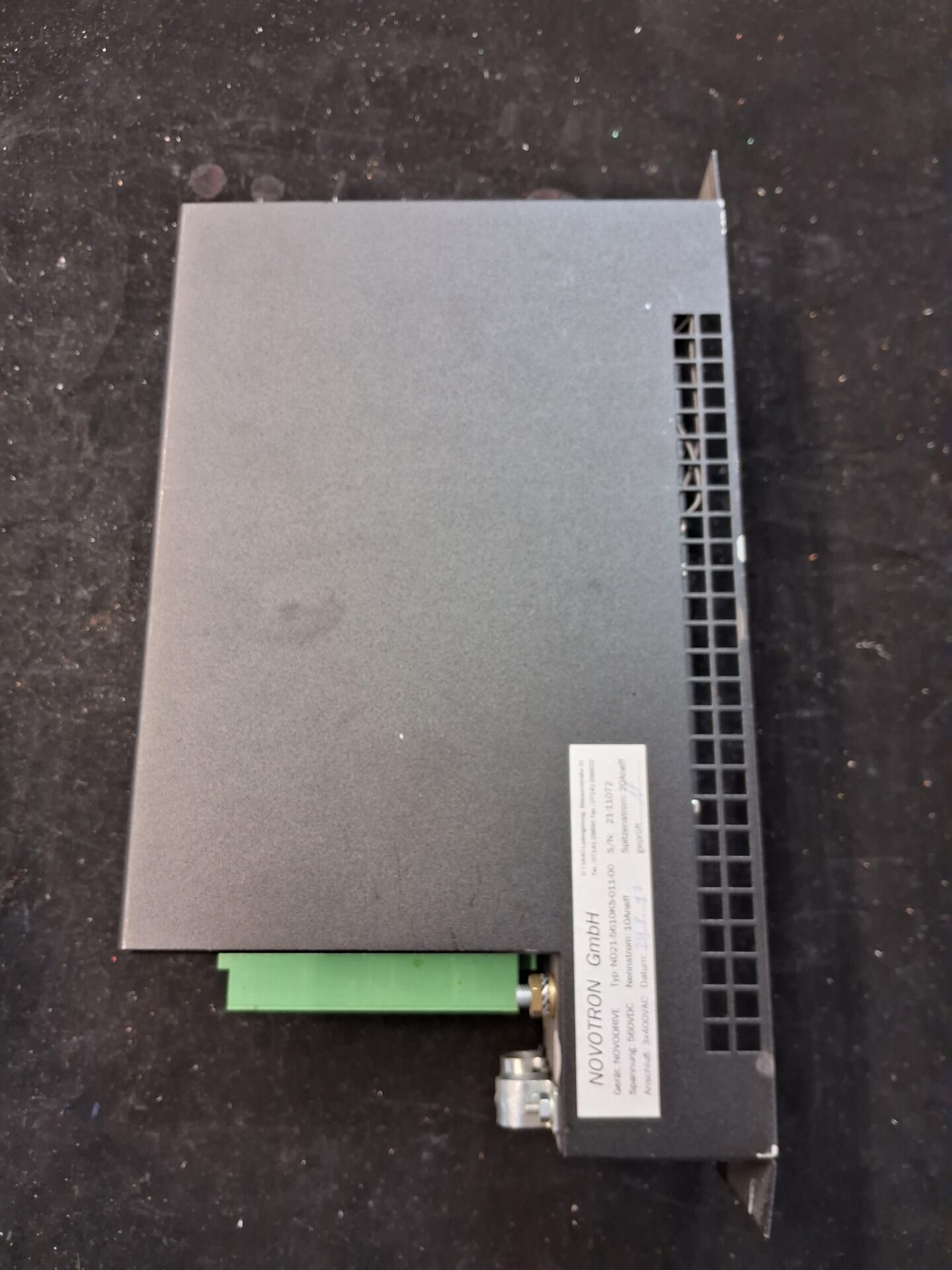 NOVOTRON NOVODRIVE ND21-5610KS-011-00 used servo drive, microprocessor-controlled, nominal current 10A, peak current 20A, for CNC and industrial automation. Input: 3x400VAC, Output: 560VDC. Reliable German engineering, ideal for replacement or upgrade in motion control systems.