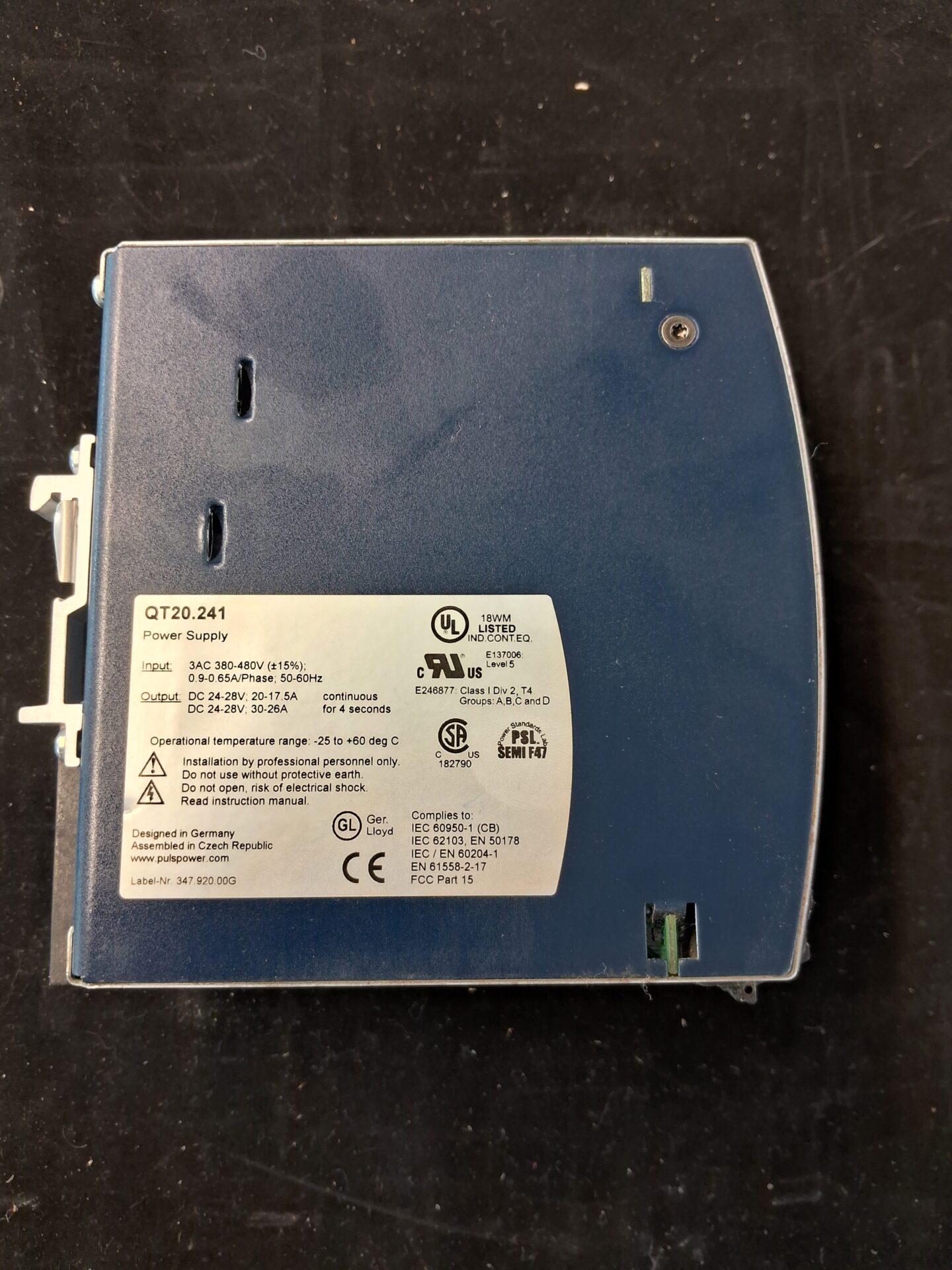 Industrial Puls Dimension Q-Series QT20.241 DIN rail mounted industrial power supply, 3-phase AC input 380-480V, regulated 24-28VDC output at 20A, 480W continuous power.